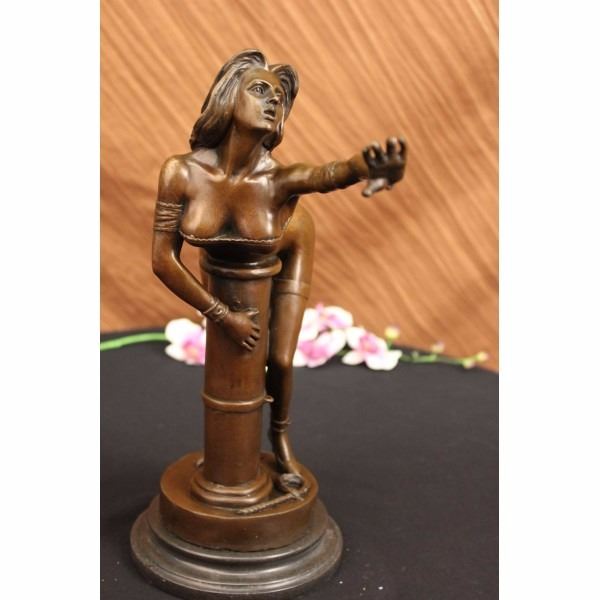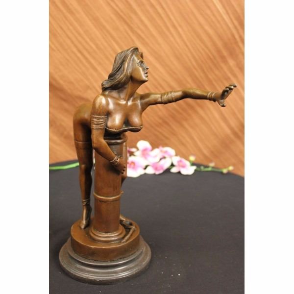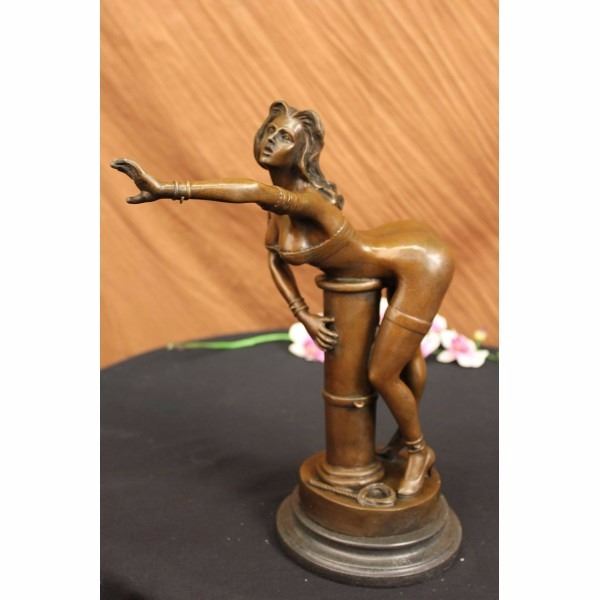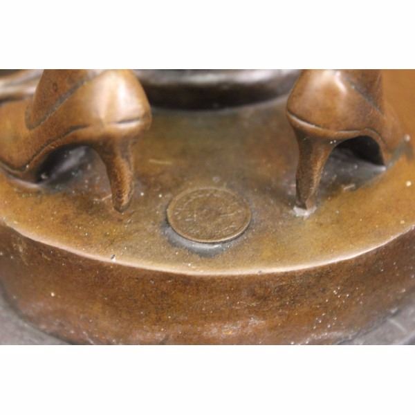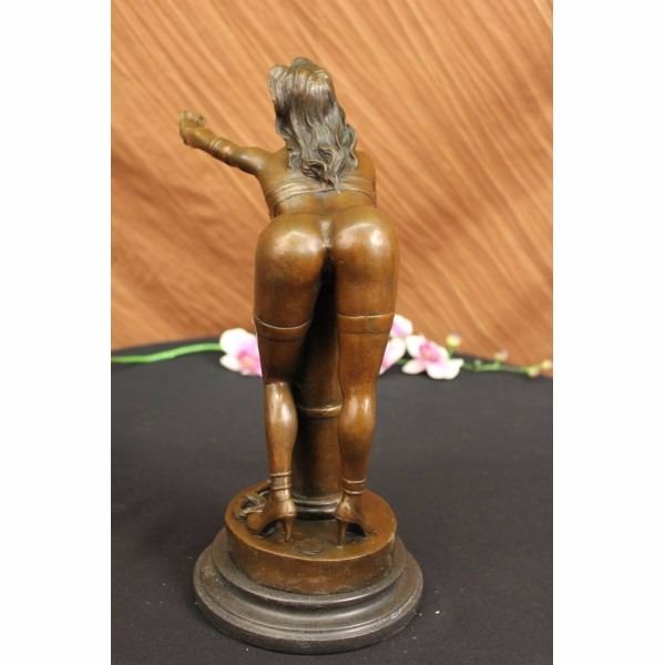 This highly erotic sculpture features a nude female in a very evocative pose exposing all of her body parts. She wears high heels while she is on her hands and knees in the midst of ( Leave it to your imagination). Curly tendrils frame her slender face and by her facial expression, one can readily see that she is enjoying her activity. This piece is definitely a great conversation starter and would make a great gift for yourself or for someone who likes to be amused. Despite its subject matter,this bronze sculpture is still a masterful and fine detailed execution, cast using the lost wax method, ensuring a highly detailed work of art that will be a treasure for years to come. Condition: This sculpture is in perfect condition. Bronze Dimensions with Marble Base:Height 14" x Width 11" Marble Dimensions: Diameter 6". Height without base: 13" Weight : 12 LBS Inventory : 18DS5097281