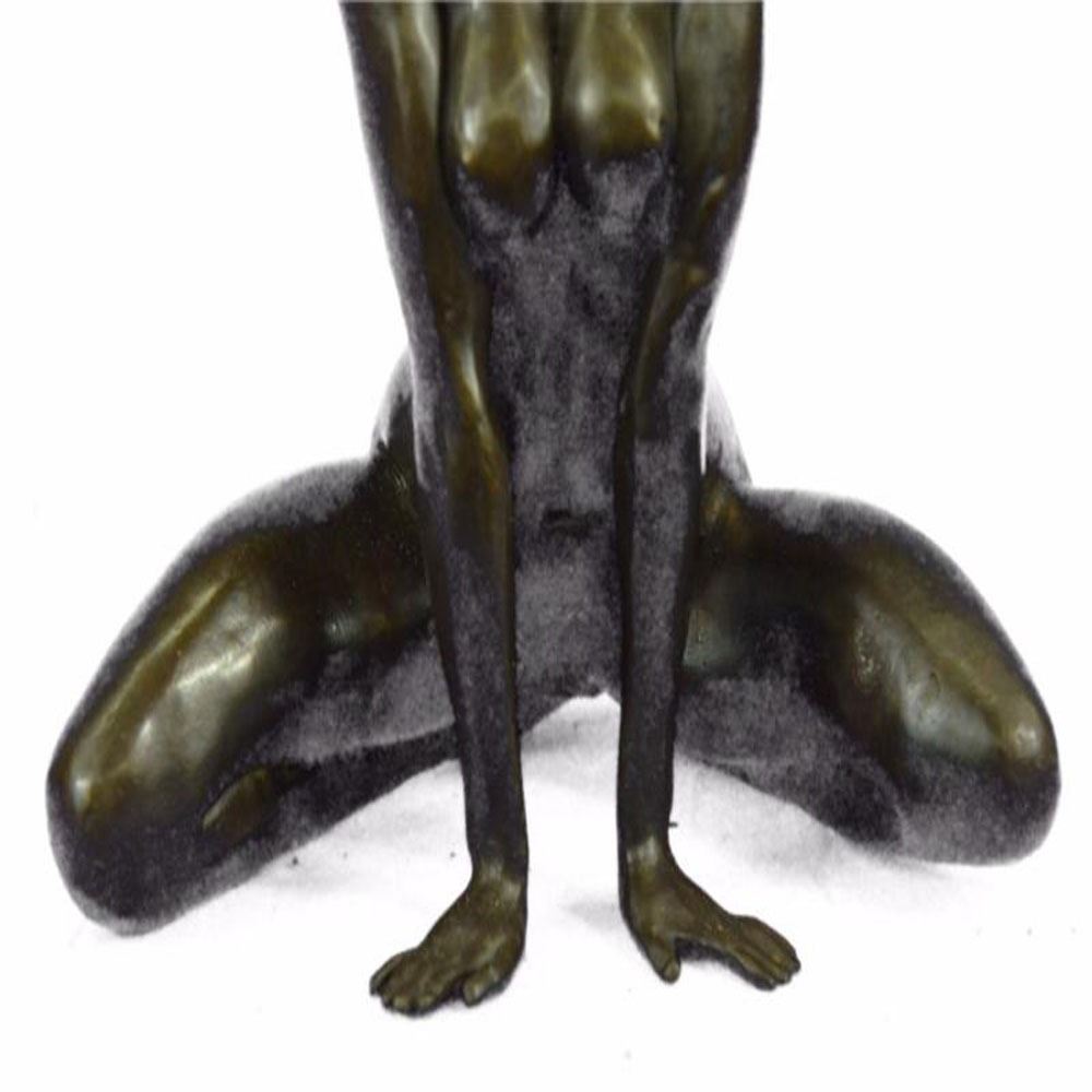 The nude seductress sits on the ground in the grasp of a feverish desire. With marked ecstasy on her face, she spreads her legs, her right arm finding the center of her pleasure. The bronze sculpture, capturing woman sexuality, was cast using the early method of lost wax casting and stained with a brown patina finish for preservation. Bronze Dimensions: Height 8 X Width 6 inches. Weight: 4 LBS.