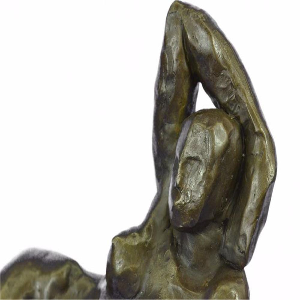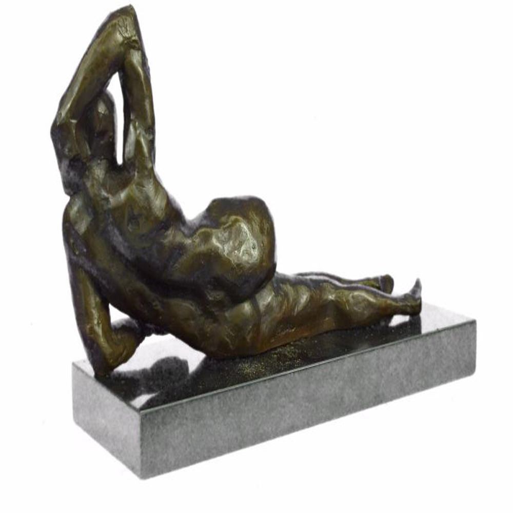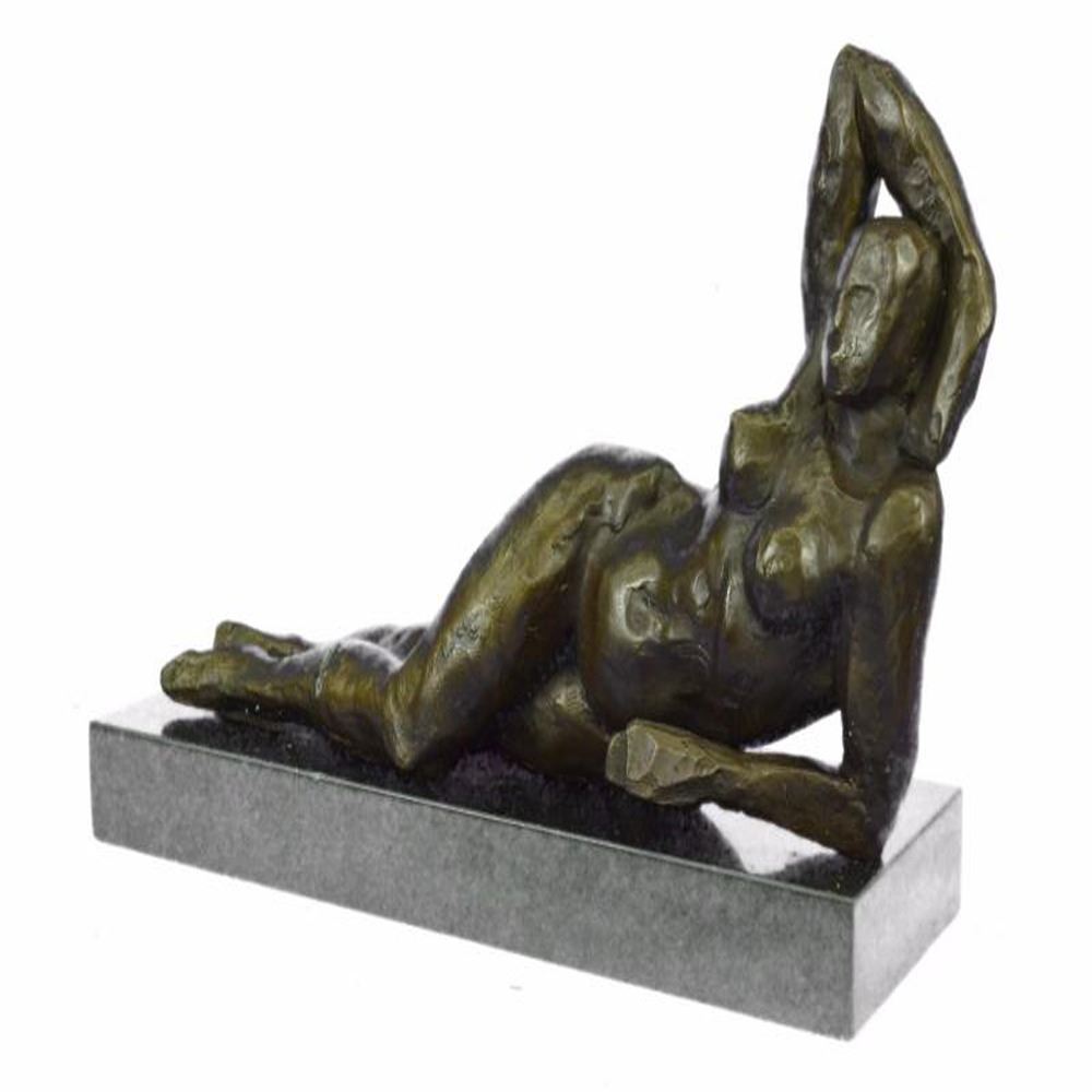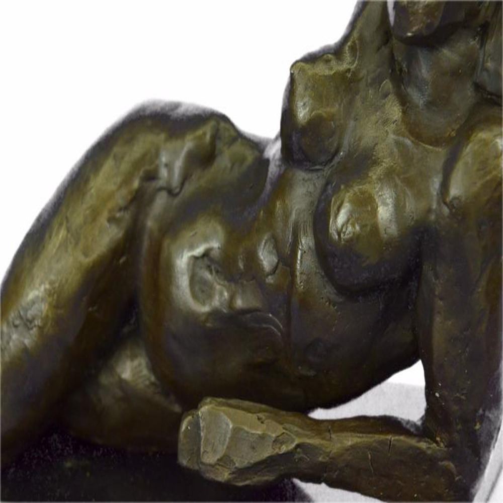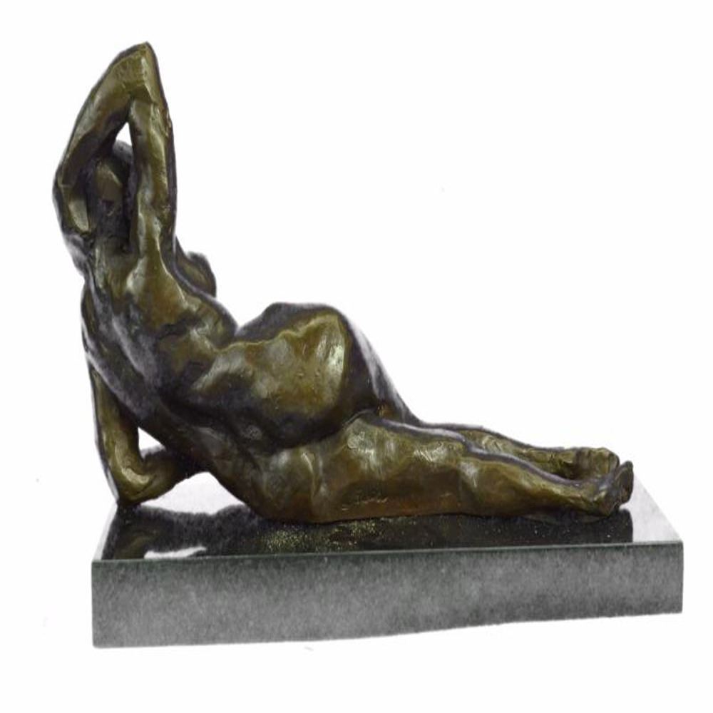 Representational style, the woman is proportionally exaggerated, giving a defined plumpness to every part of her form. The pleasantly full figured lady lays on ground both calm and relaxed. Her head tilts dexterously upwards as she casts her eyes to the blue skies of a beautiful summer day. A sense of peace and happiness runs across her smile. Her left arms hangs downward onto her lap. Her right arm rest on the ground as if she were posing for the beholder. She was created using the lost wax method of casting. This technique allows the molten precious metal to mold to the smallest detail of the artists cast. Fantastic detail is seen in the folds of skin on her stomach, neck and mouth. The Bronze Sculpture with a brown patina finish is mounted upon a marble. Bronze Dimensions with Marble Base: Height 9 X Width 13 inches. Weight: 13 LBS.