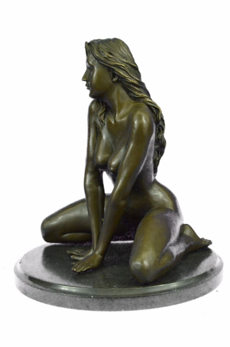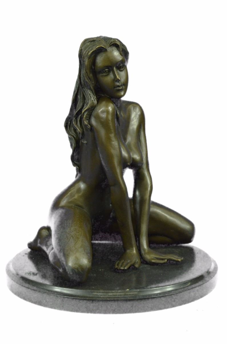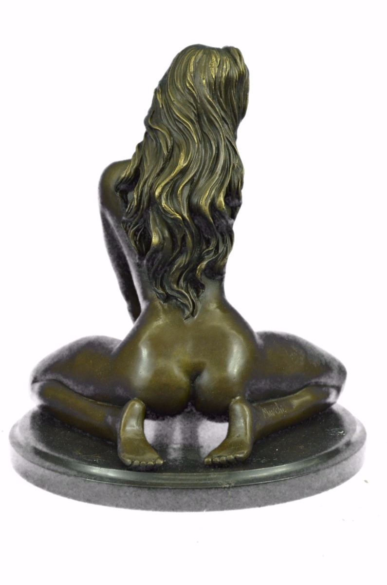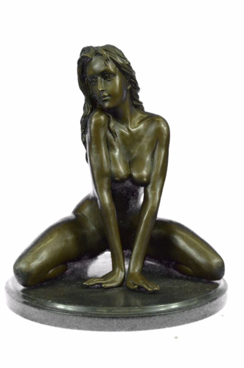 She Kneels Down And Sits On Her Heels As If She Is Dancing To A Song. Her Hair Falls Down Do Her Back And Her Face Is One Of Ease And Pleasure. She Shakes Her Bracelets To The Music And Enjoys The Sound Of Them Along With The Music. Her Stomach Is Tight And Flat And Her Legs Are Thick. She Is Beautiful In An Exotic Way And Is A Beautiful Depiction Of A Woman Comfortable In Her Own Skin. This Sculpture Was Cast Using The "Lost Wax Method" And Has As Brown Patina. She Is Mounted On A Marble Base And Is Perfect For A Shelf Or Night Stand And Is Signed By Artist Mavchi. Bronze Dimensions With Marble Base:Height 9.5" X Width 8" Marble Dimensions: Diameter 8". Height Without Base: 8.5" Weight : 9 Lbs.