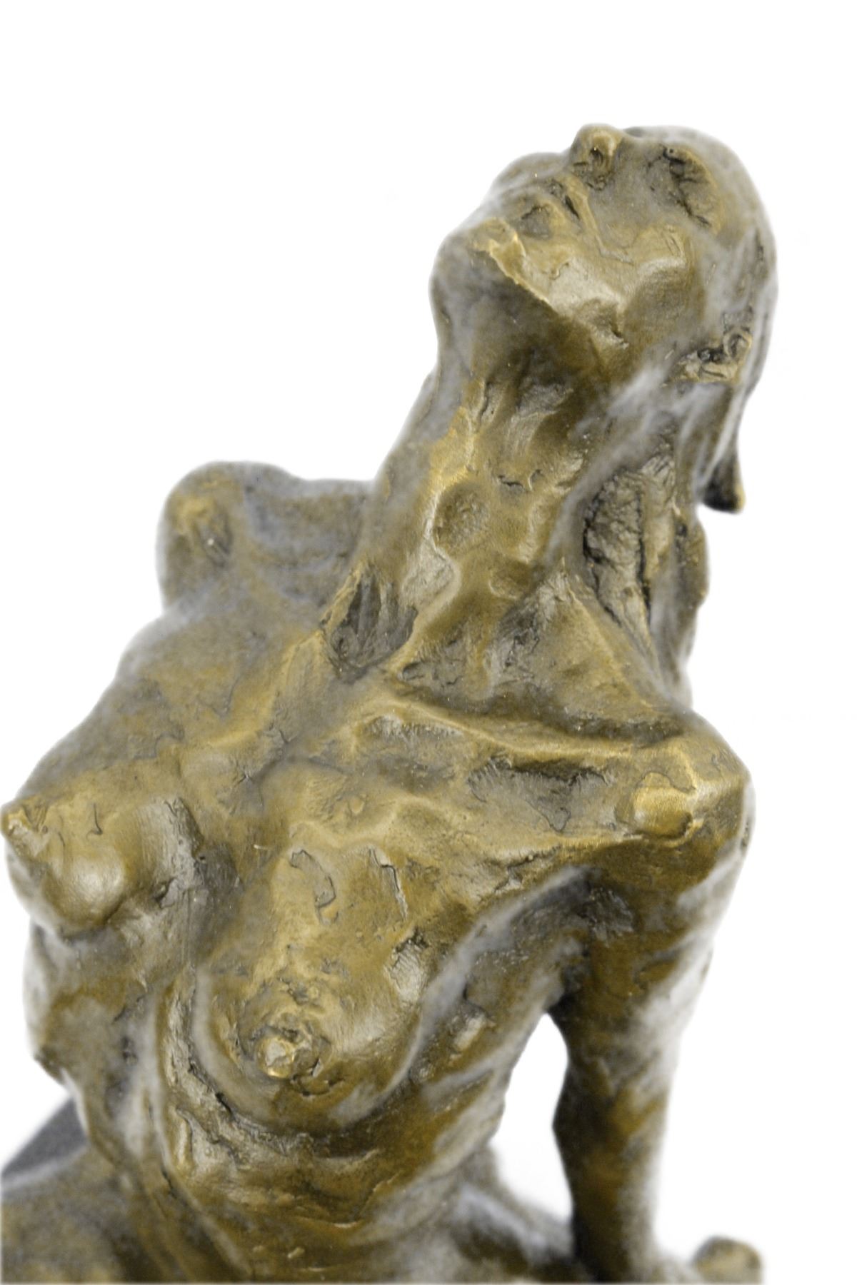 She Sits Crossed Legged In Lotus Position, Her Head Thrown Back And Her Back Is Arched In Pleasure. The Nude Woman Places Her Hands Behind For Support. The Rawness Of This Sculpture Is Heightened By The Ragged Stone-Like Surface. This Carnal And Rugged Sculpture Was Crafted Using The Lost Wax Method. It Rests On A Black Marble Base. Bronze dimensions with marble base: Height 13 X Width 8 inches. Weight: 20 lbs.Please Note: This is a reproduction bronze sculpture from the original molded and signed. This featured bronze sculpture is a recast after the original, and has been done recently. This 100% bronze sculpture is an abstract piece certain to be a conversation piece.Please Note: This is a reproduction bronze sculpture from the original molded and signed. This featured bronze sculpture is a recast after the original, and has been done recently. This 100% bronze sculpture is an abstract piece certain to be a conversation piece.
