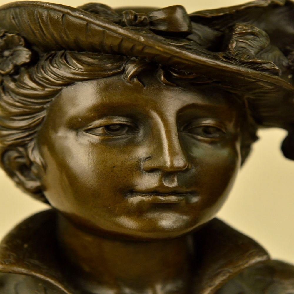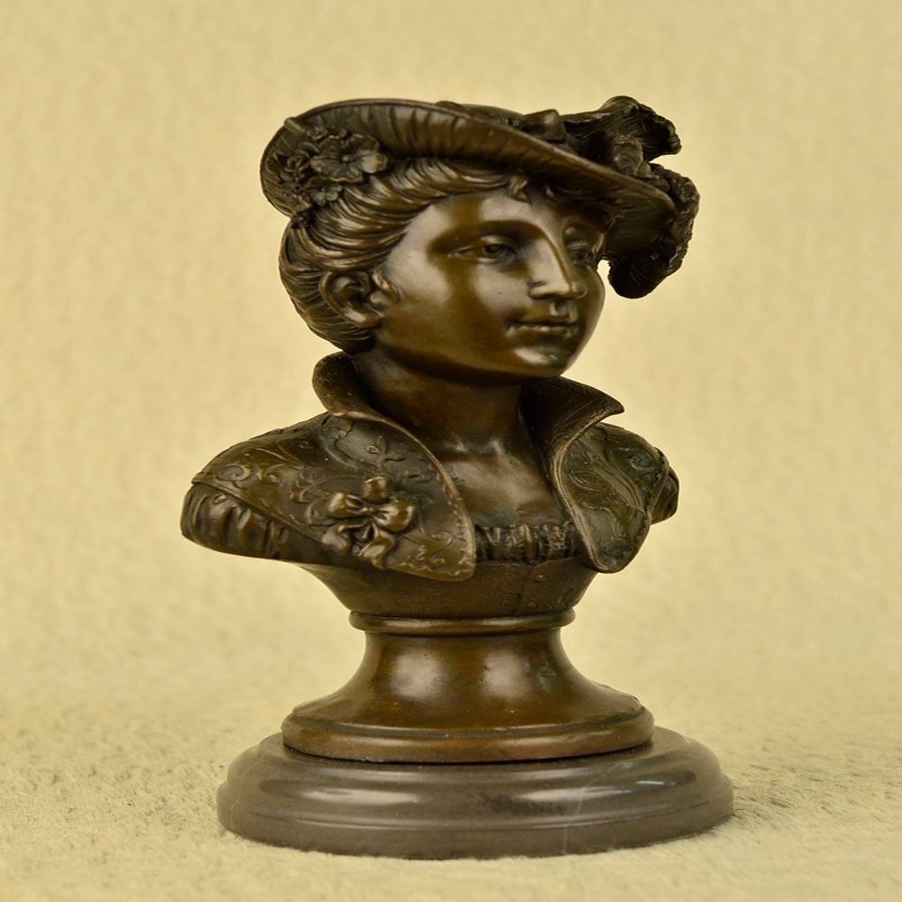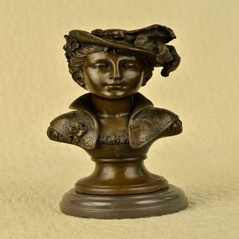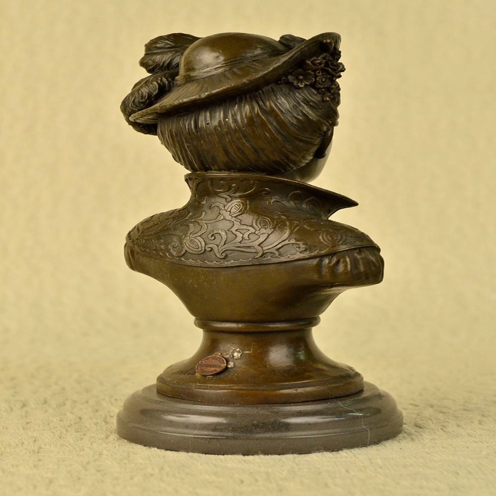 A chic European woman is dressed to impress. She naturally radiates elegance in her daily life. A wonderful headdress adorns her head and is shifted off to the side of her face. The 100% Bronze bust Sculpture highlights this elegance in the portion of the outfit that is made visible. The piece stands on a copper toned base. The ageold lost wax method was used to carefully craft this Sculpture. Bronze Dimensions with Marble Base: Height 11 X Width 5 inches. Weight: 9 LBS.