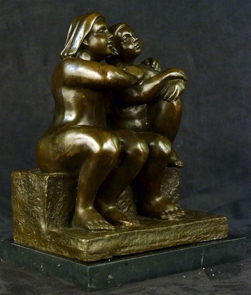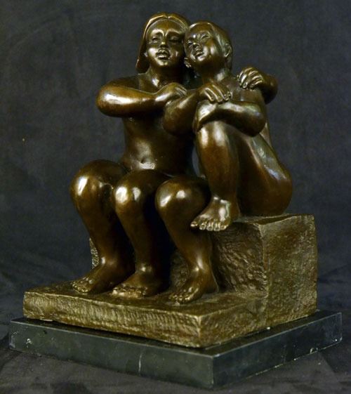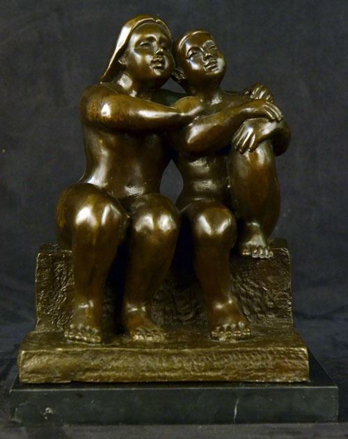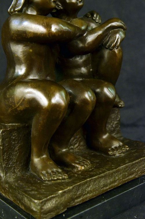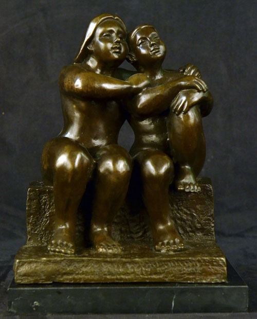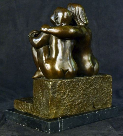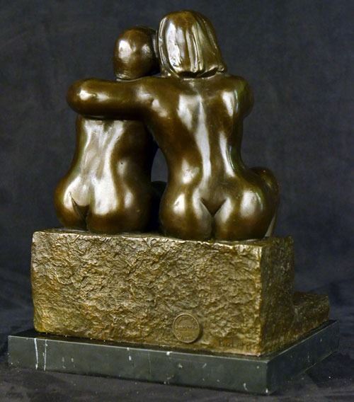 The Curvy Nude Man Romantically Holds Her Partner As They Seat On A Bench. The Two Look Into Each Other Eyes To A Night They Will Always Remember In Their Hearts. She Seems To Blush Due To The Gushing Admiration She Gets From Her Partner As They Lock Fingers And Firmly Hold Eachothers Body. This Bronze Is Cast In The Traditional Lost Wax Casting Process. This Is A Multi Step Process That Insures A Quality Bronze Sculpture That May Be Passed Down From Generation To Generation. This sculpture is very interesting a bronze recast based on the original piece. Bronze Dimensions With Marble Base: Height 14" X Width 10". Weight: 25 Lbs.