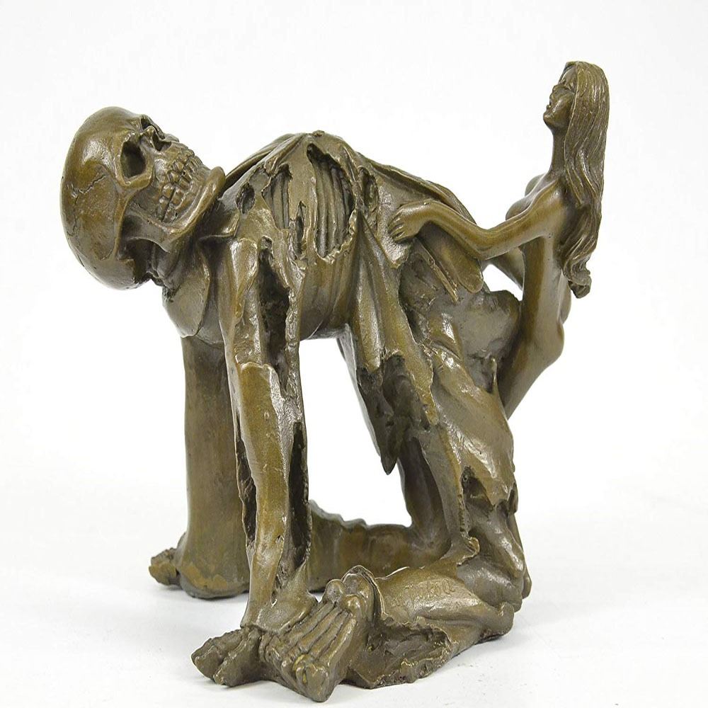 The angel of death swoops down to plant the fatal kiss in this Skeleton statue Amazingly sculpted exclusively for, from Nude erotic female body and bony fingers of the angel of death, this high-quality statue is cast in quality designer bronze with a dark brown patina finish to highlight each gallery-worthy detail. This bronze sculpture was cast using the archaic method of lost wax casting and stained with a brown patina finish for perpetuation. Dimensions: Height 6 X Width 9 Inches. Weight: 7 LBS.