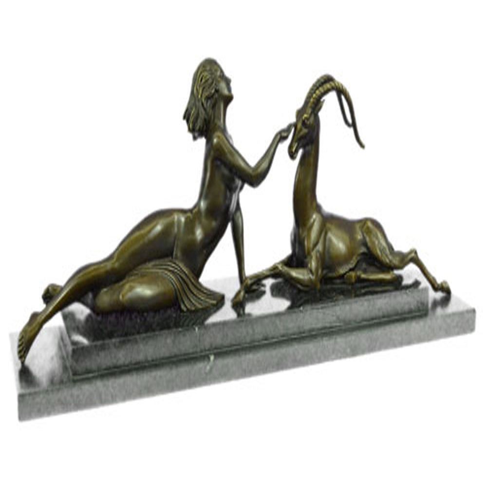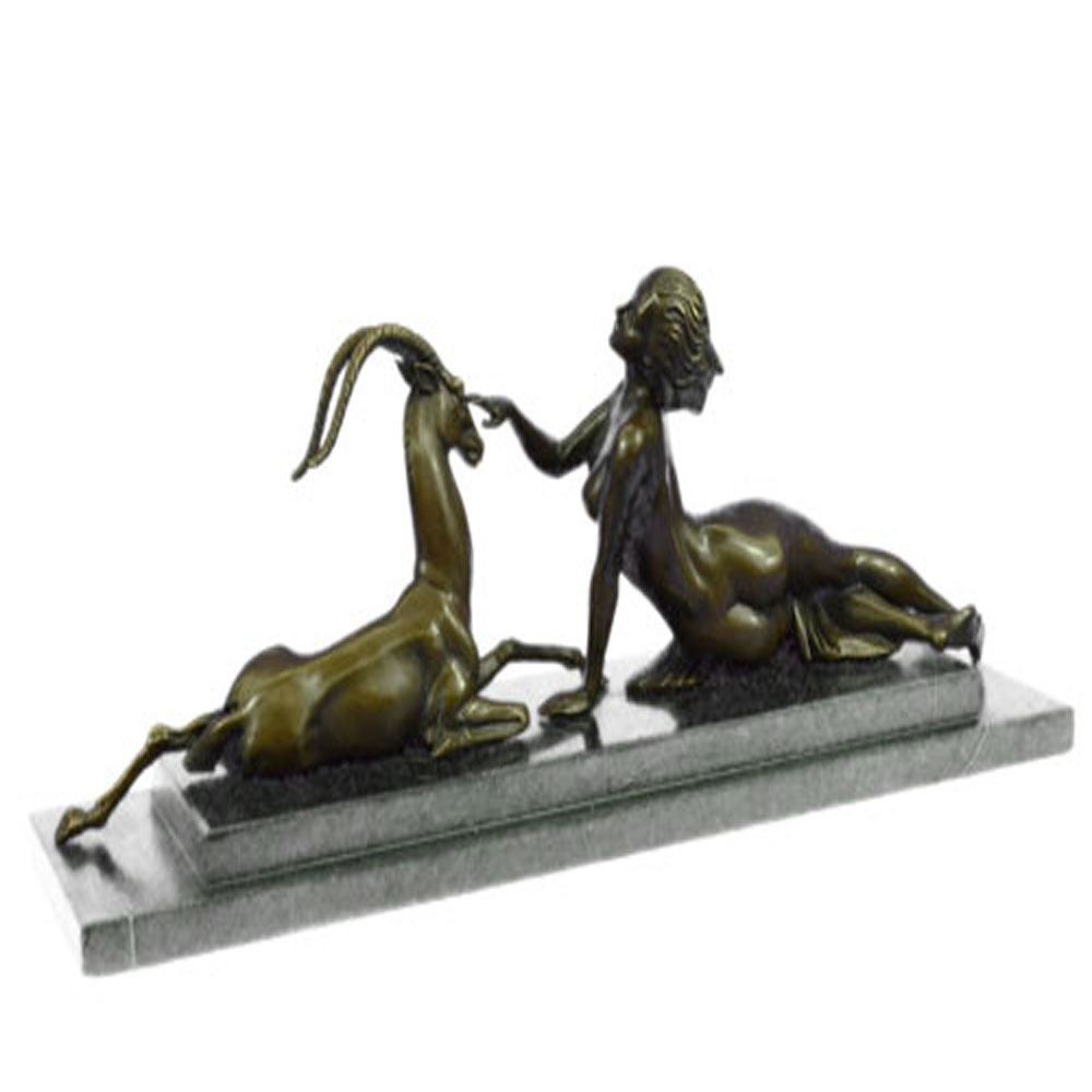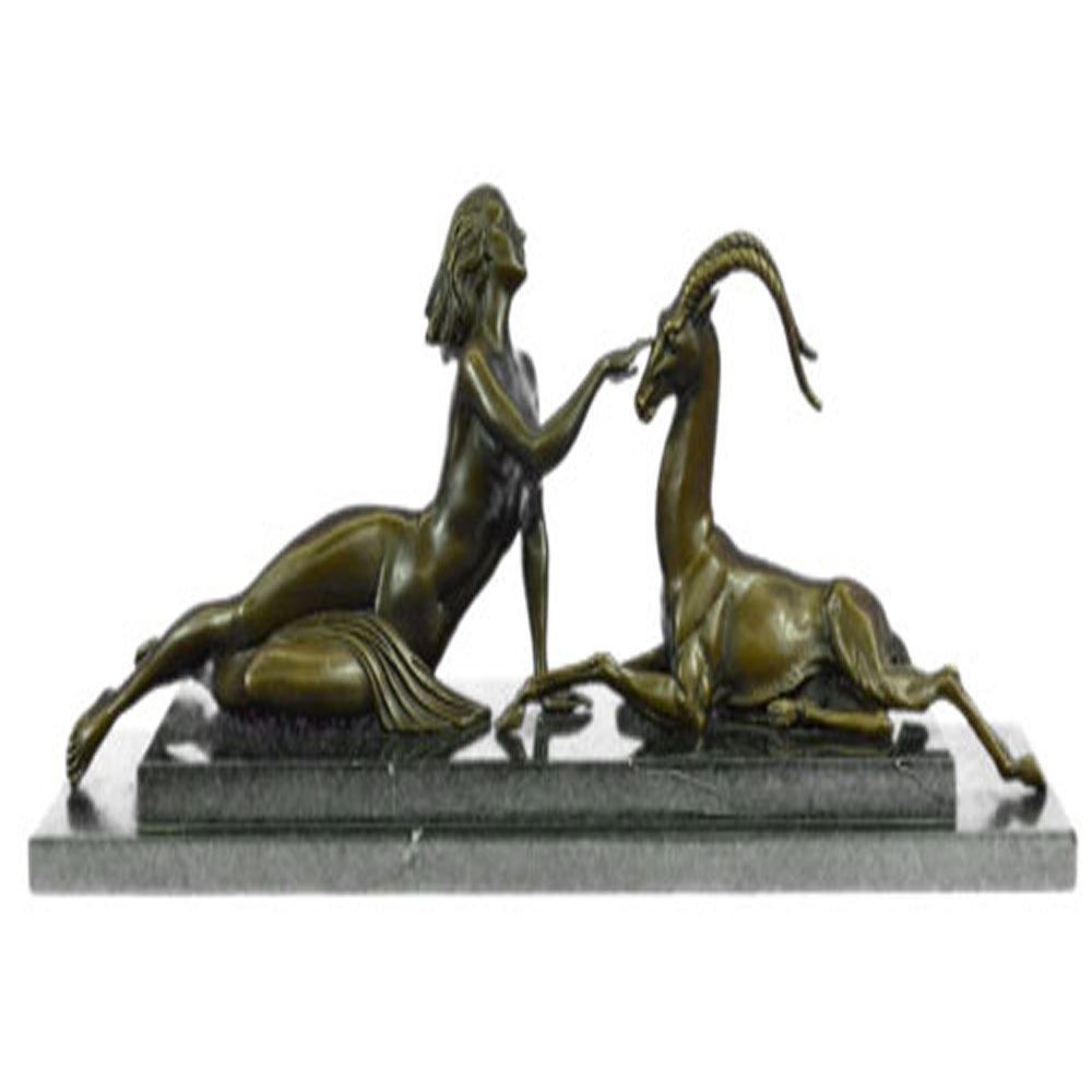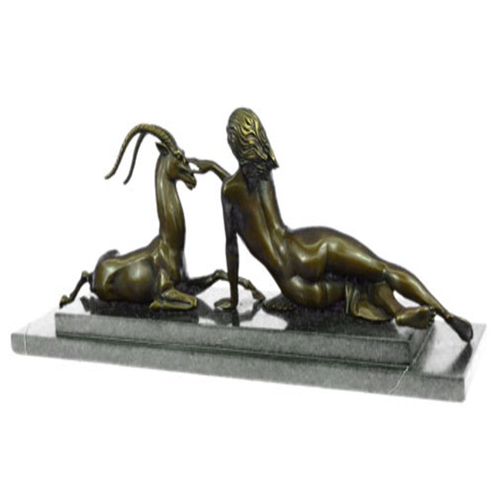 Bronze nude petting a goat. This exquisite sculpture depicts a naked woman petting a goat head. This attractive piece would enhance a garden or a patio. It would make a beautiful gift for anyone who loves classic sculpture and for collectors of fine bronze. Bronze Dimensions with Marble Base: Height 7 X Width 19 inches. Weight: 15 LBS.