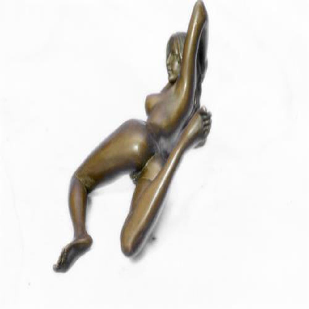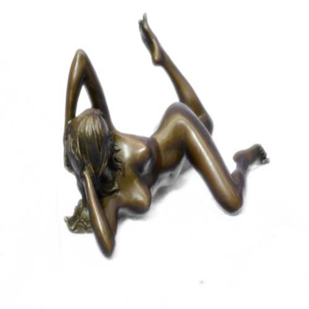The nude temptress lying on floor wearing nothing in the grasp of a feverish desire. With marked ecstasy on her face, she arches her back. Her right arm reaching back to find the center of her pleasure. The Bronze Sculpture, capturing woman sexuality, was molded using the early method of lost wax casting and stained with a brown patina finish for preservation. Bronze Dimensions: Height 4 X Width 8 inches. Weight: 4 LBS.