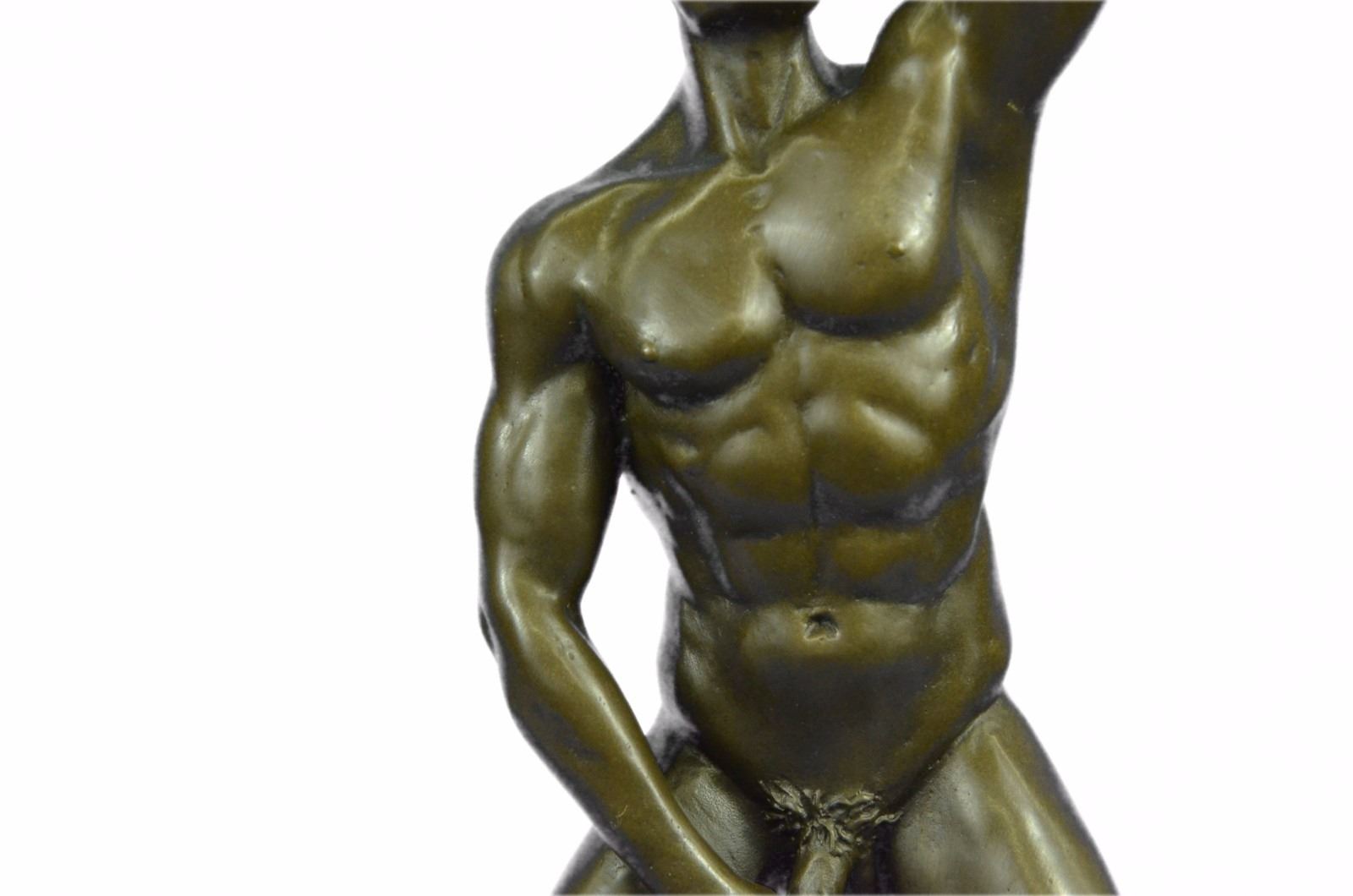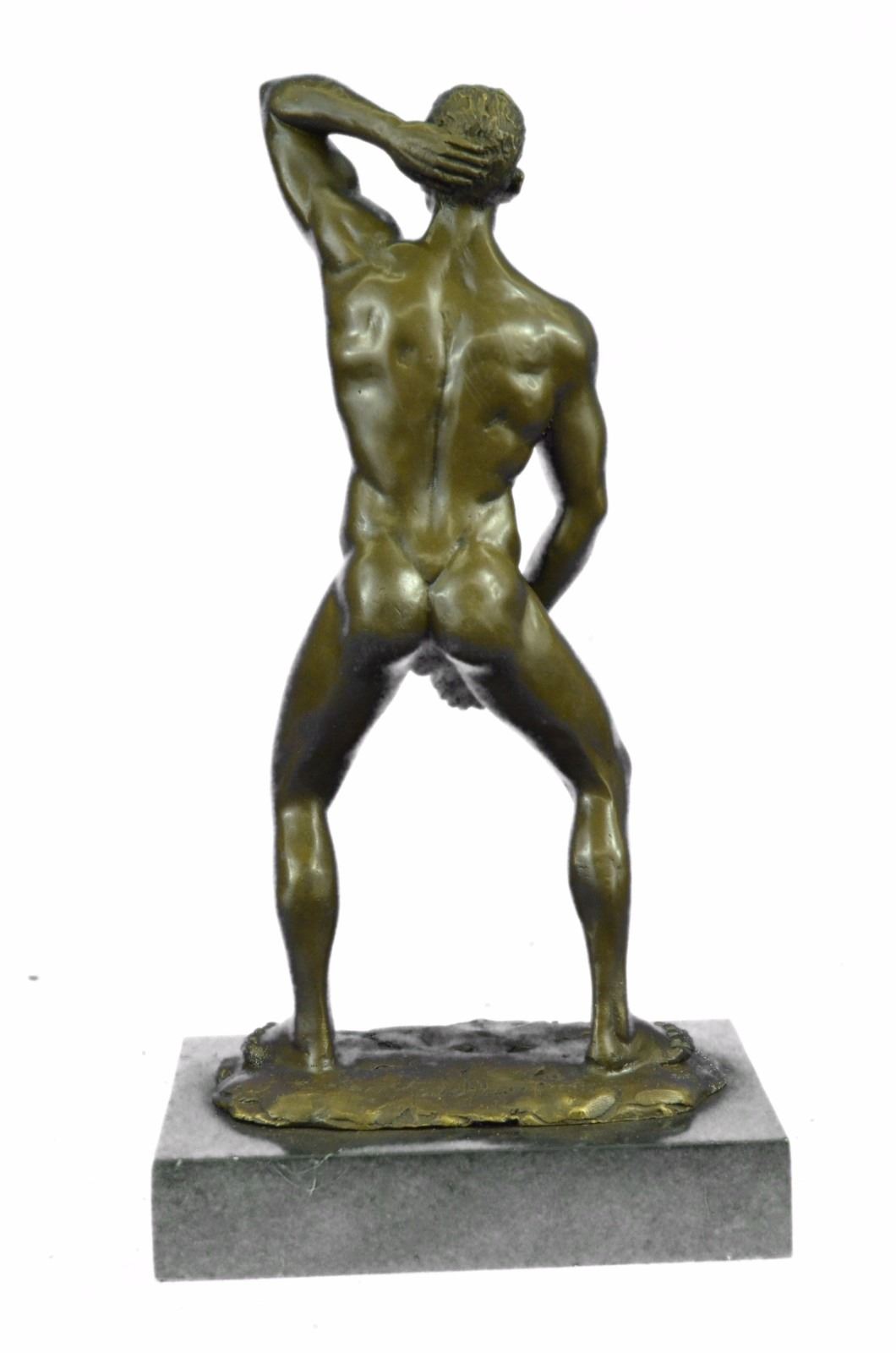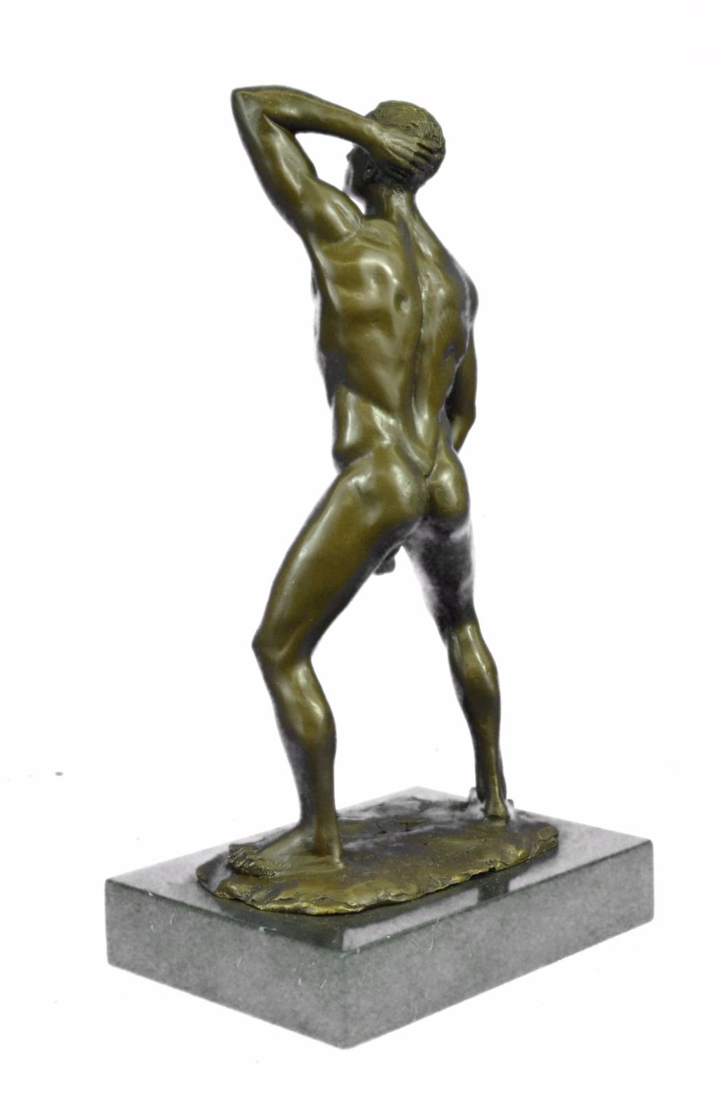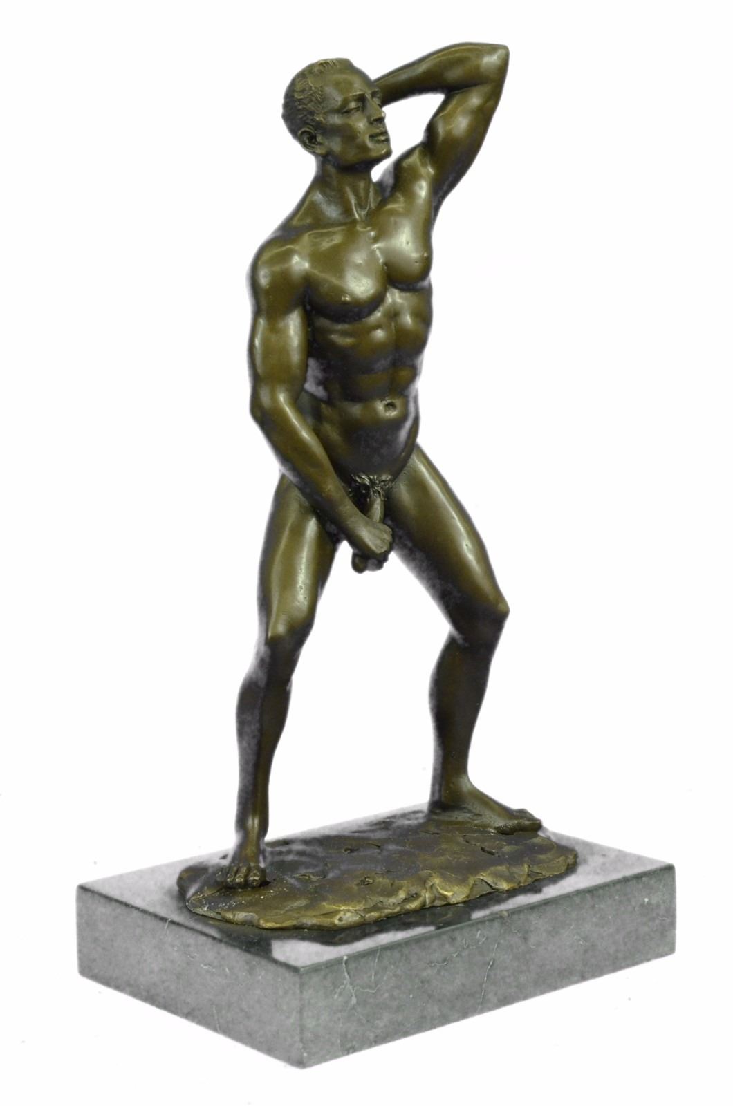 He boldly stands in the buff with a look of fearless determination. This proud gay man exposes his manly erection, proving he knows no shame. Just one example of his gorgeous body. He is lean and muscular. Take a gander at his chiseled torso and chest. He would be right at home at New York's Chippendale's and would drive all the guys and dolls mad with desire. This confident stud was cast using the Lost Wax Method. 100% handmade bronze and carefully detailed this is a priceless unlimited edition piece of work. Bronze Dimensions with Marble Base: Height 12 X Width 7 inches. Weight: 8 LBS. Inventory: 47ST0865174