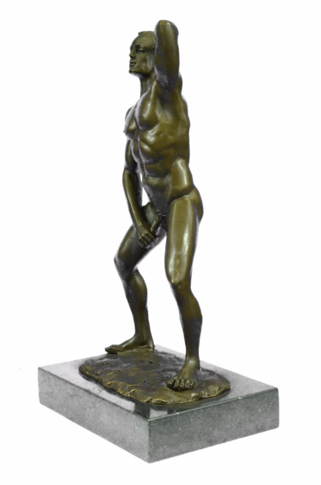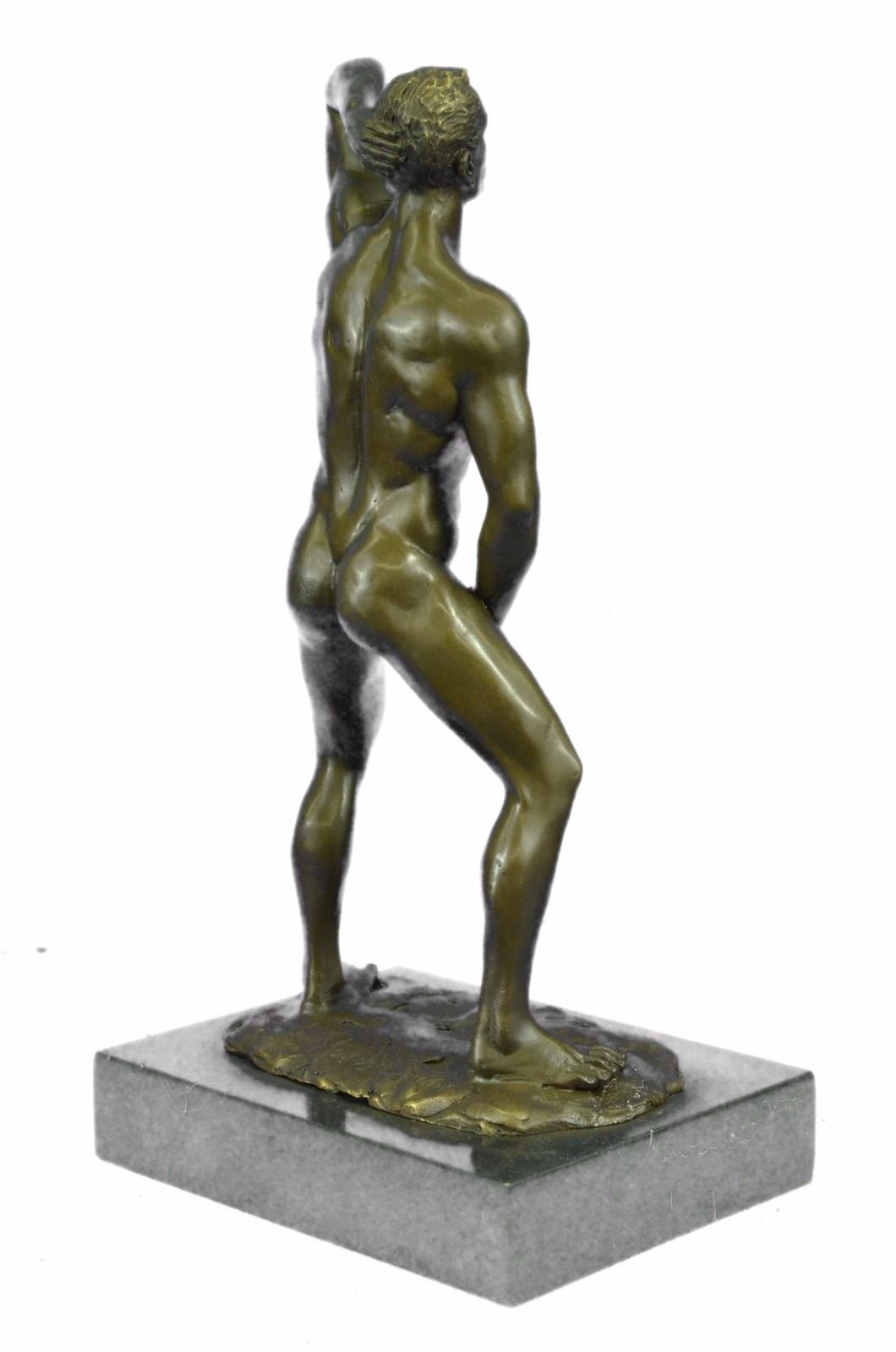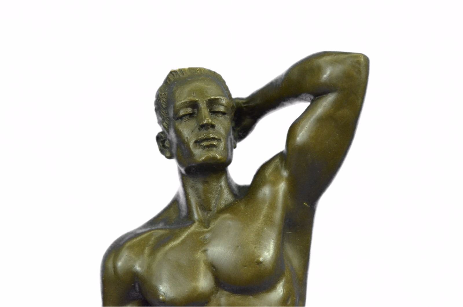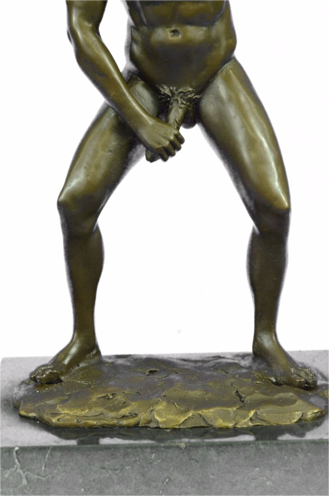 He boldly stands in the buff with a look of fearless determination. This proud gay man exposes his manly erection, proving he knows no shame. Just one example of his gorgeous body. He is lean and muscular. Take a gander at his chiseled torso and chest. He would be right at home at New York's Chippendale's and would drive all the guys and dolls mad with desire. This confident stud was cast using the Lost Wax Method. 100% handmade bronze and carefully detailed this is a priceless unlimited edition piece of work. Bronze Dimensions with Marble Base: Height 12 X Width 7 inches. Weight: 8 LBS. Inventory: 47ST0865174