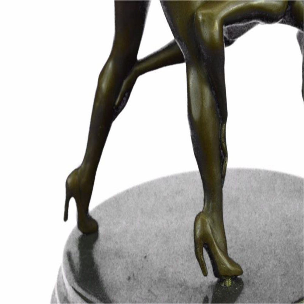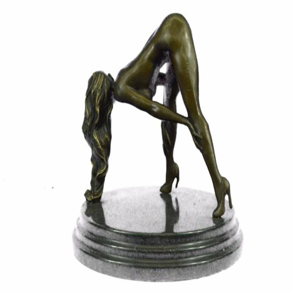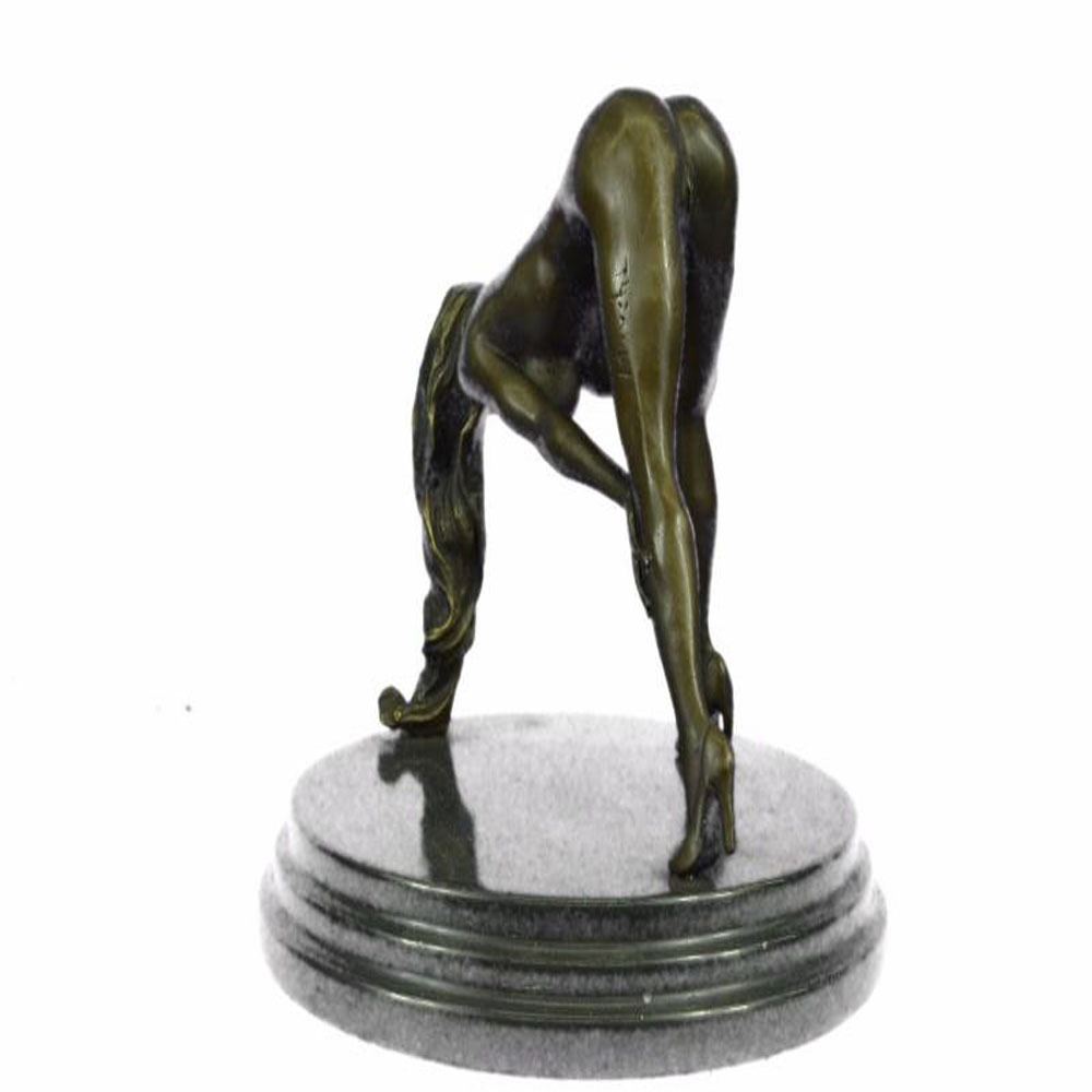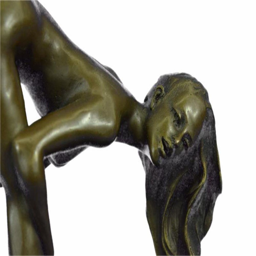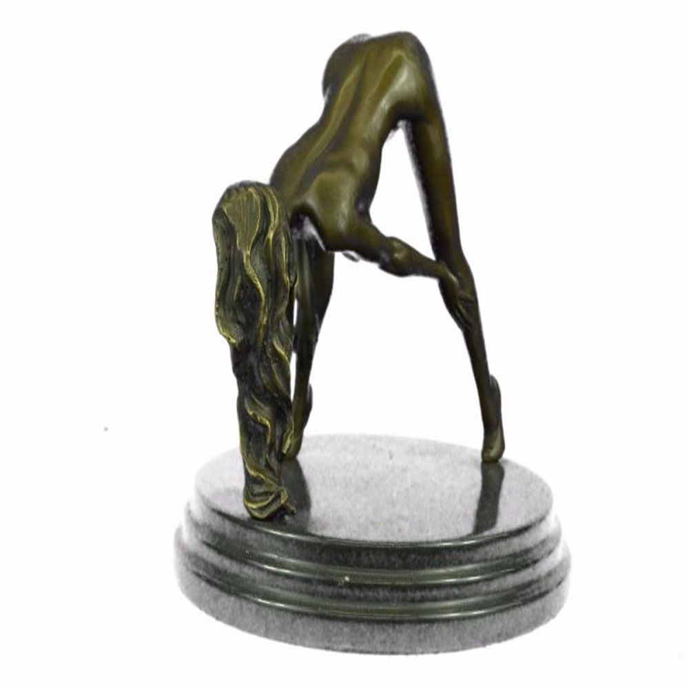 The nude seductress lies on the ground in the grasp of a feverish desire. The Bronze Sculpture, capturing woman sexuality, was cast using the early method of lost wax casting and stained with a brown patina finish for preservation. She is mounted upon a black marble base. Bronze Dimensions with Marble Base: Height 7 X Width 9 inches. Weight: 8 LBS.