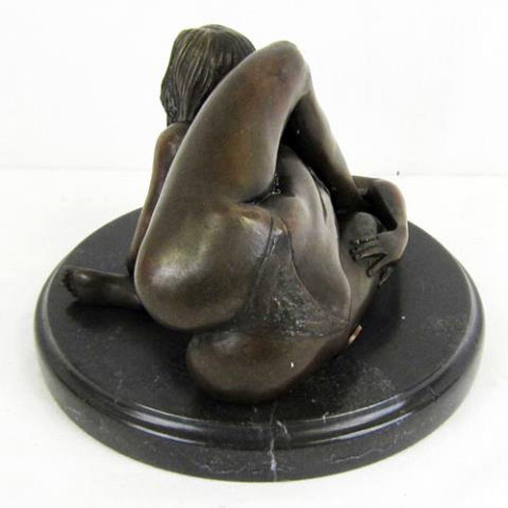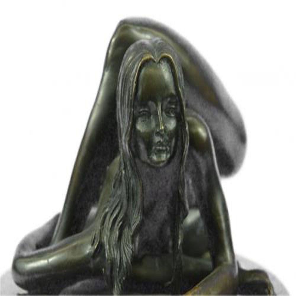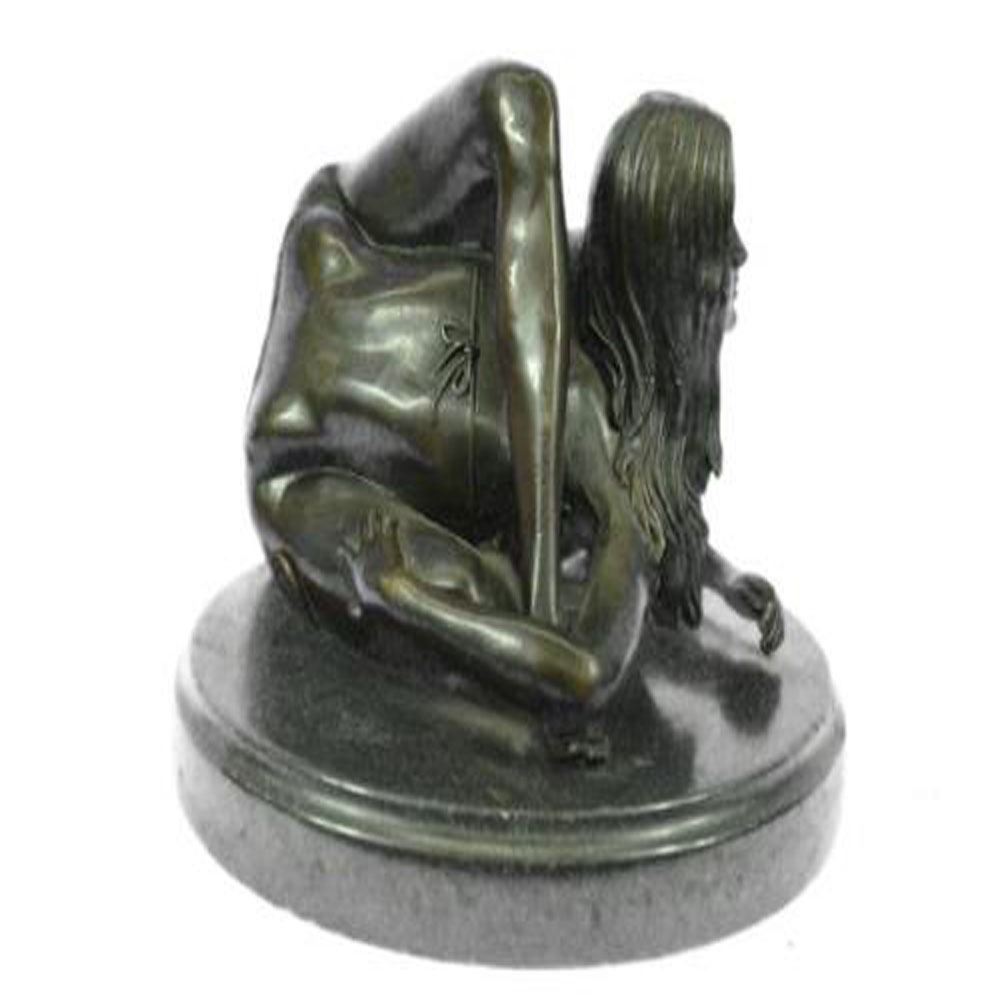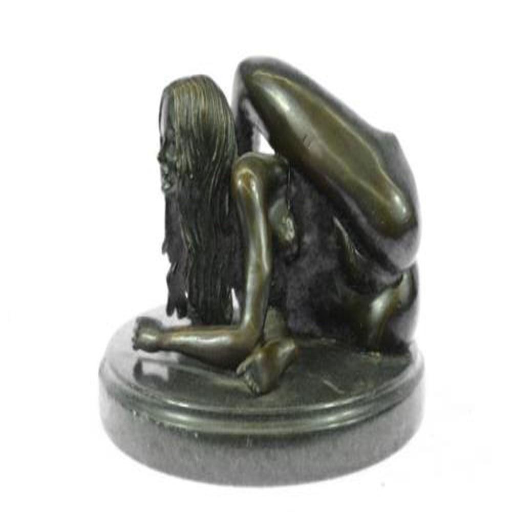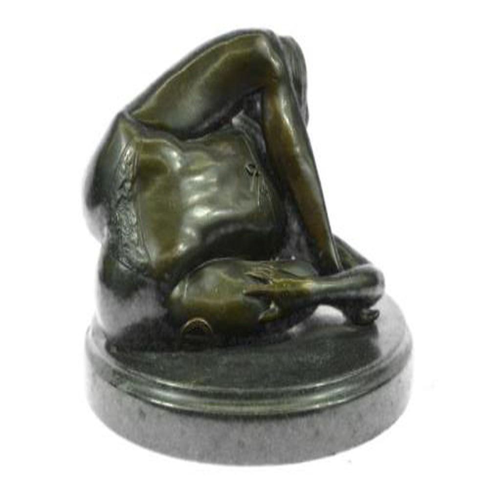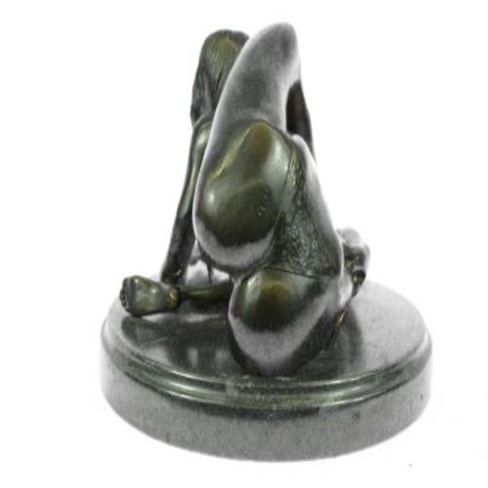 With extreme grace and expertise our beautiful exotic dancer extends her leg all the way back and up folding them behind her head. Showing great flexibility and contortionist she twists and tUrns her nude body allowing it to fold upward like the petals of an opening flower. The detail on the piece is exquisite, her hair fall gorgeously down in front of her pose, long and wavy hair compliments her signature contortionist pose. Not a lot of people are able to bend in such crazy forms but the lucky ones that could do so, show much natural talent. It has a remarkable resin white patina and has been cast using the Lost Wax Method. It is 100% Bronze and 100% handmade. Bronze Dimensions with Marble Base: Height 6 X Width 7 inches. Weight: 8 LBS.
