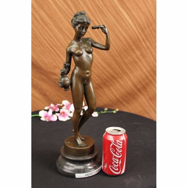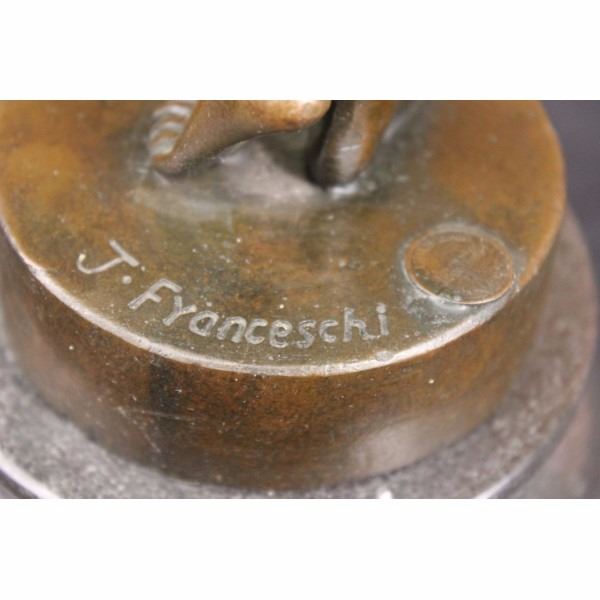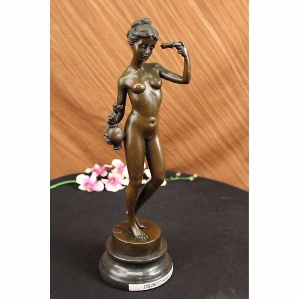 She is an artist's muse. She is comfortable standing before his easel and being the inspiration for the strokes of his paintbrush. She poses with the items he's given her as props. She cradles one on her hip and holds the other up. She is fully nude and shows off her slender figure and round breasts.100% bronze and handmade, this brown patina sculpture was cast using the "Lost Wax Method" and mounted on a marble base and is signed J. Franceschi. Condition: This sculpture is in a very Good condition. Bronze Dimensions with Marble Base:Height 17" x Width 5" Marble Dimensions:Diameter 5" Height without base: 14 1/2" Weight :12 LBS Inventory : 63DS2623736