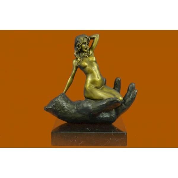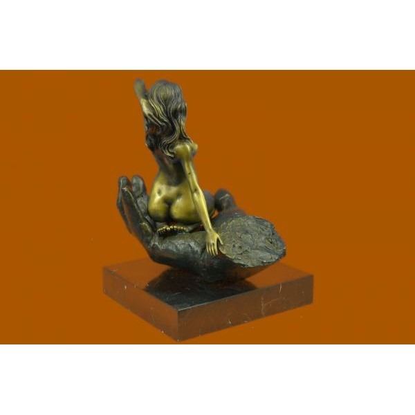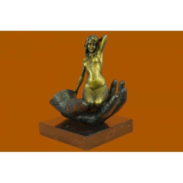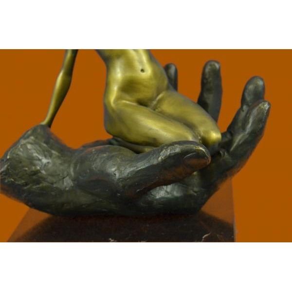 Created in solid bronze this wonderfully unique sculpture is beautifully abstract in design. Balancing with perfect poise the female figure is the stunning in detail and has been finished in a regal gold. Enchantingly individual the interior decoration lends a quirky sense of character to any setting. This unique piece was crafted using the lost wax method. The sculpture stands on a black marble base. Bronze dimensions with marble base: Height 9 X Width 8 inches. Weight: 10 lbs.Please Note: This is a reproduction bronze sculpture from the original molded and signed. This featured bronze sculpture is a recast after the original, and has been done recently. This 100% bronze sculpture is an abstract piece certain to be a conversation piece.Please Note: This is a reproduction bronze sculpture from the original molded and signed. This featured bronze sculpture is a recast after the original, and has been done recently. This 100% bronze sculpture is an abstract piece certain to be a conversation piece.