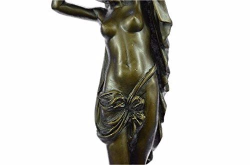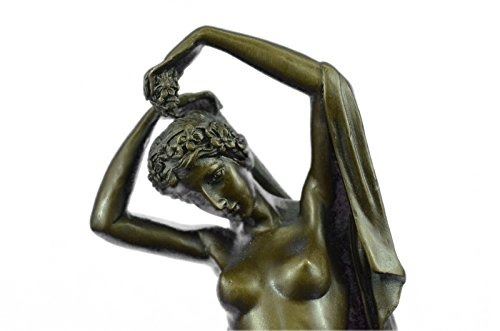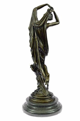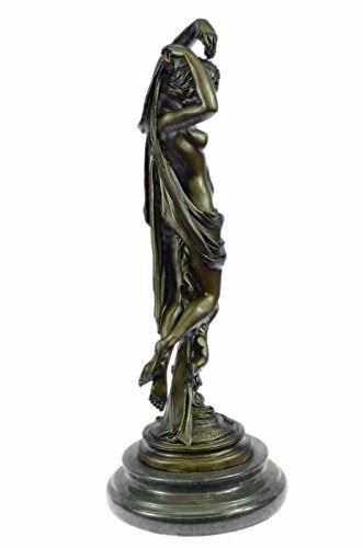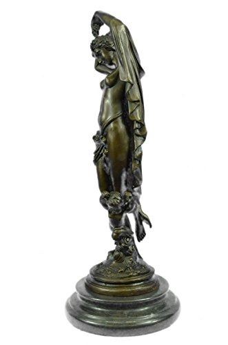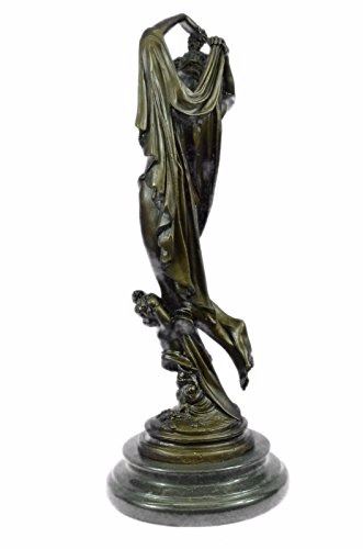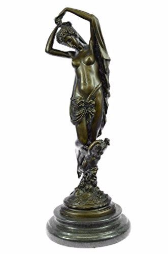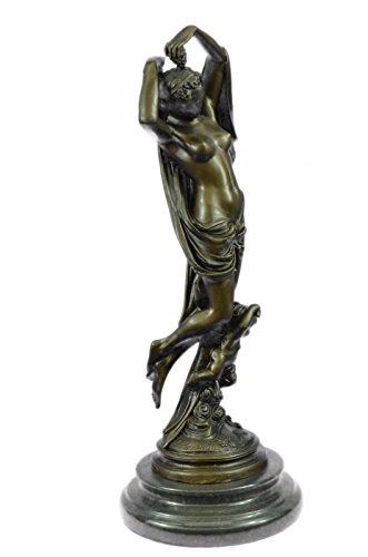 The Beautiful Maiden Seems Glides Into The Air On The Back Of A Winged Cherub. This Sculpture Is Laden With The Hellenistic Approach Of Art With ItS Mythology And Natural Grace. She Kneels On The Back Of The Cherub While A Long Robe Sinuate Around Her Nude Form. Both Figures Hold Up Above Their Heads A Bundle Of Flowers. The Handmade Bronze Sculpture Was Cast Using The Age-Old Method Of Lost-Wax Casting And Stained With A Brown Patina Finish For Preservation and It Is Mounted Upon A Black Marble Base. Bronze dimensions with marble base: height 15 x width 6 inches. Weight: 9 lbs.Please Note: This is a reproduction bronze sculpture from the original molded and signed. This featured bronze sculpture is a recast after the original, and has been done recently. This 100% bronze sculpture is an abstract piece certain to be a conversation piece.Please Note: This is a reproduction bronze sculpture from the original molded and signed. This featured bronze sculpture is a recast after the original, and has been done recently. This 100% bronze sculpture is an abstract piece certain to be a conversation piece.