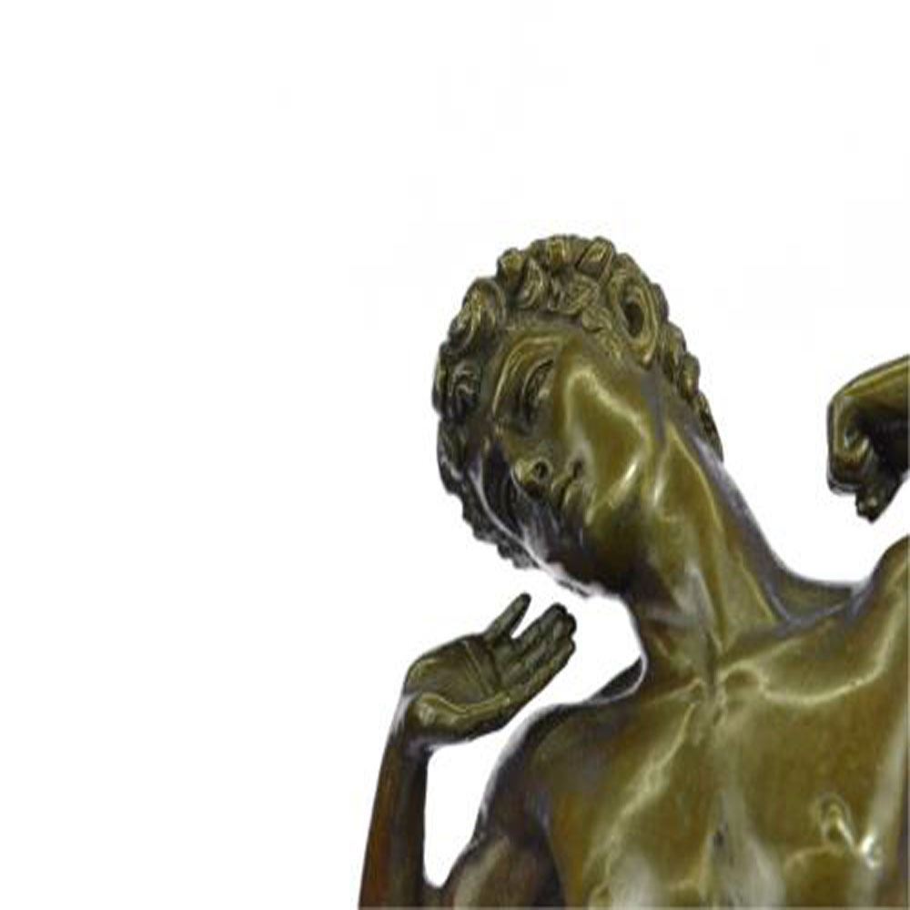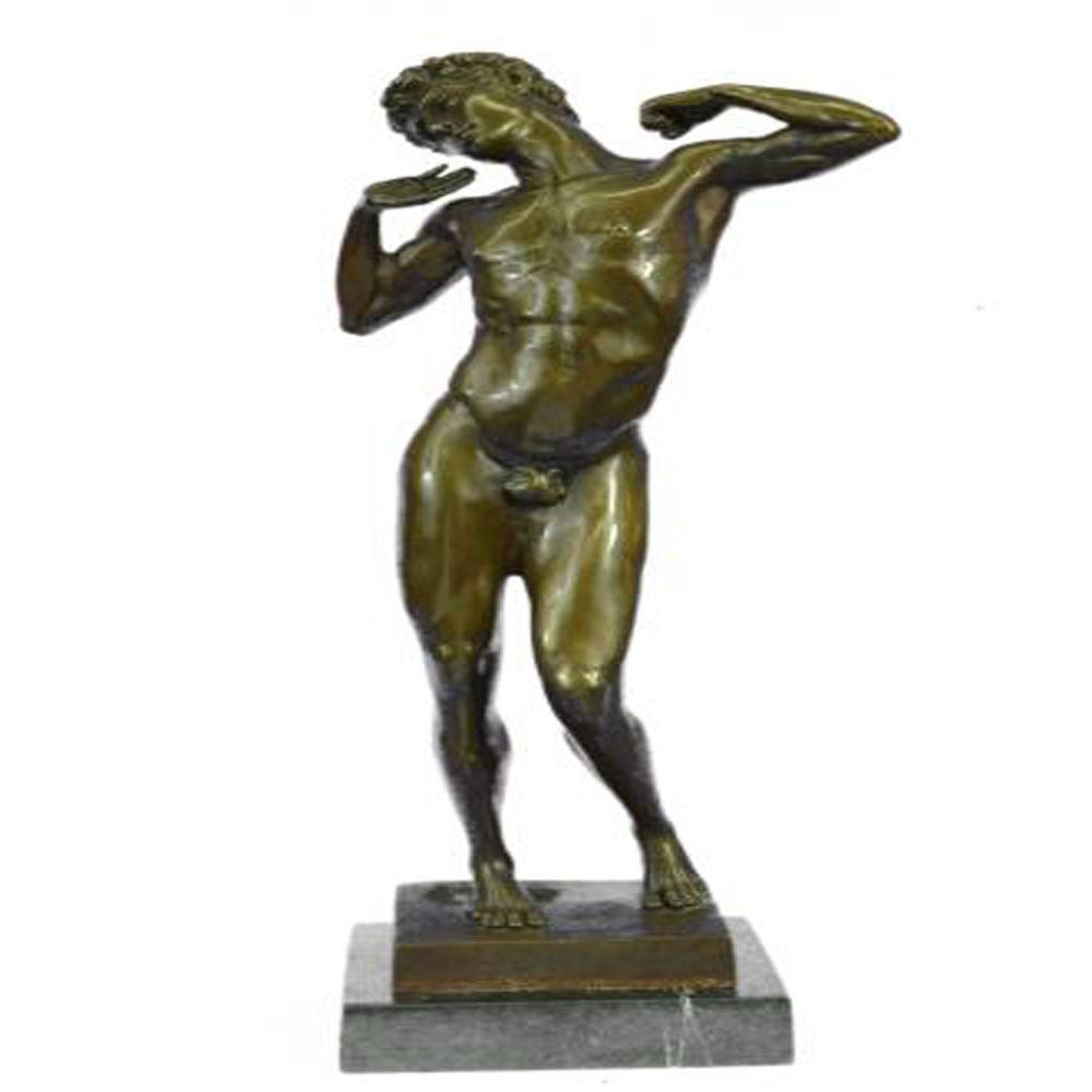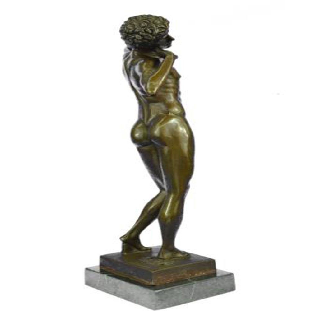The nude man can be imagined stretching his arms among the morning sun streaming in through an open window. His eyes hold the sleepiness of his dreams and a certain lightness of attitude. Through his pose the anatomy and the muscular movement of the body is perceived. He was fashioned using the ancient method of the lost wax technique and stained with a brown patina finish for conservation He stands upon a marble base. Bronze Dimensions 17 X Width 8 inches. Weight: 10 LBS.