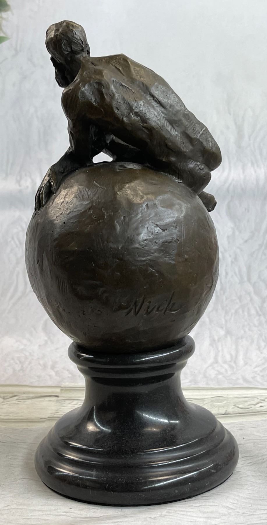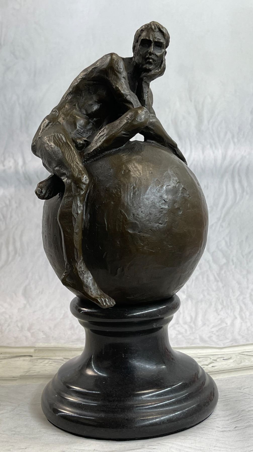This amazing sculpture art piece of a male sitting on top of the world the way he came to it, nude. As he holds his head up with his left hand he slouches over leaning on his left elbow and putting full body weight on it as he thinks about all the cruel and evil things that go on in this world we live in. His body structure is amazing and intricately detailed. This is a beautiful bronze sculpture cast using the Lost Wax Method and has a gorgeous brown patina and it is mounted on a marble base. Dimensions: Height 11 X Width 7 inches. Weight: 10 LBS.