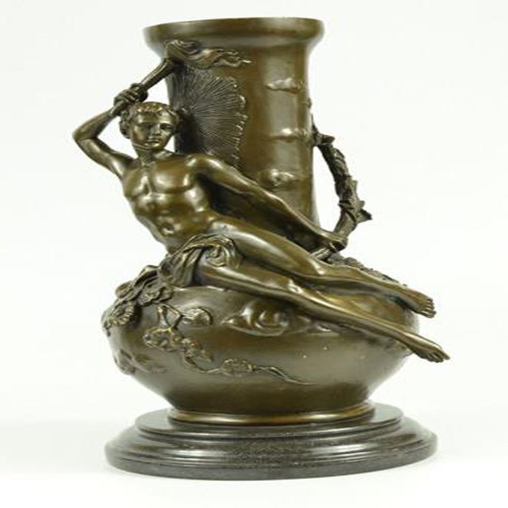 This gorgeous Bronze vase shows a man lying in a relaxed mood carrying torch above his head as flowers surround him. His privates are coved with a flowing robe which wraps around him and the vase. He is Dawn, he holds a torch above his head leading the way for the sun to follow. Behind him he sun follows you can see the rays of the sun beam behind his head. Small clouds float all over the vase and add to the simplicity of this piece. The flowers have great intricate detail adding to the dimension of this Sculpture. He has great proportion and his muscles are magnificent. This is the perfect gift to give to that of a flower lover. This Sculpture was cast using the Lost Wax Method. Bronze Dimensions with Marble Base: Height 13 X Width 8 inches. Weight: 15 LBS.