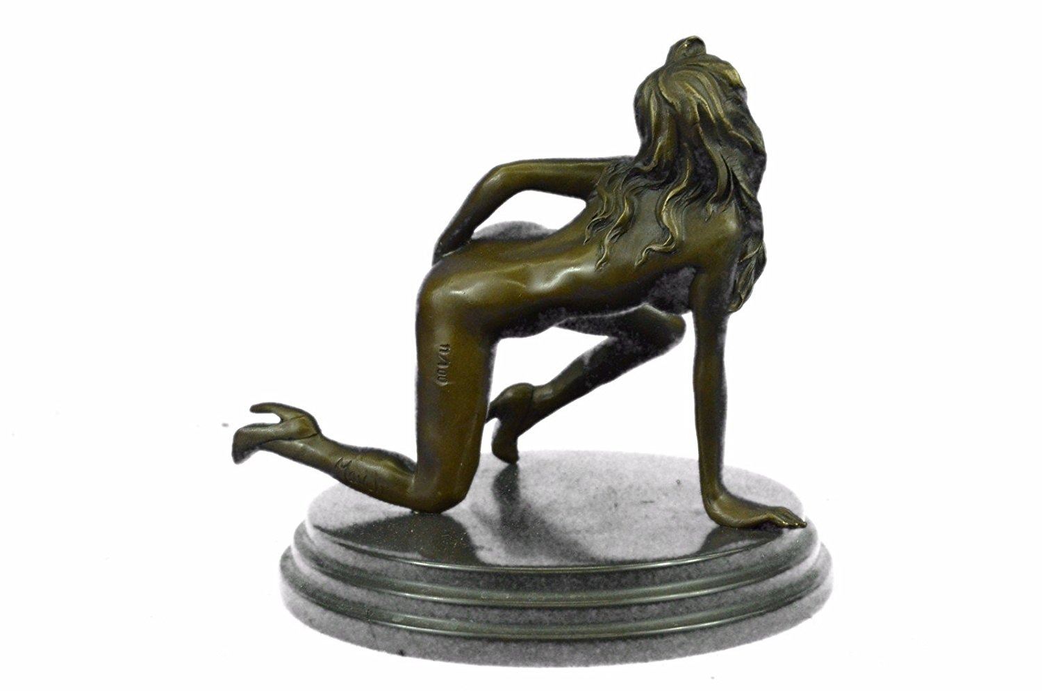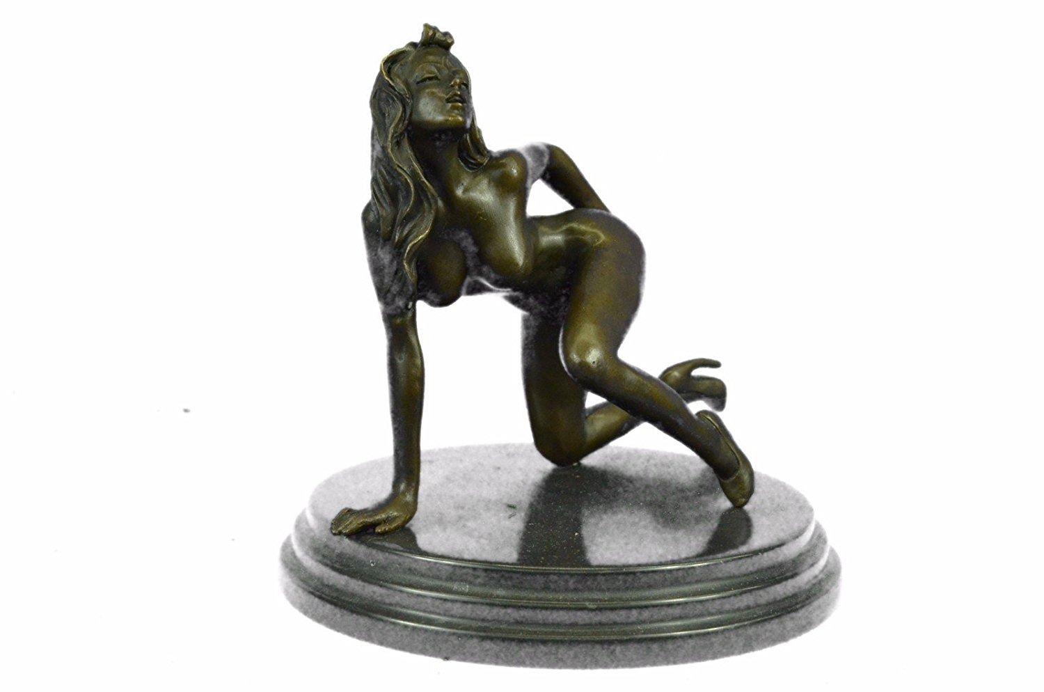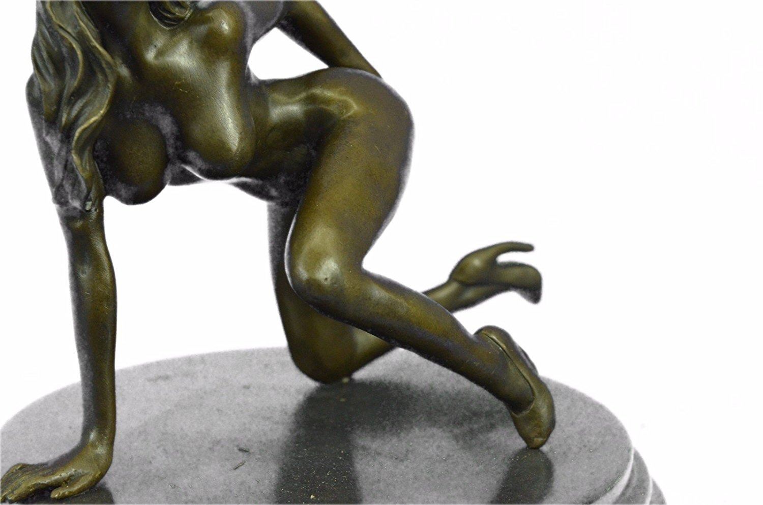 The nude seductress crawls on the ground in the grasp of a feverish desire. The bronze sculpture, capturing woman sexuality, was cast using the early method of lost-wax casting and stained with a brown patina finish for preservation. This sculpture is mounted upon a black marble base. Bronze Dimensions with Marble Base: Height 8 X Width 8 inches. Weight: 7 LBS. Inventory: 79ST0804497