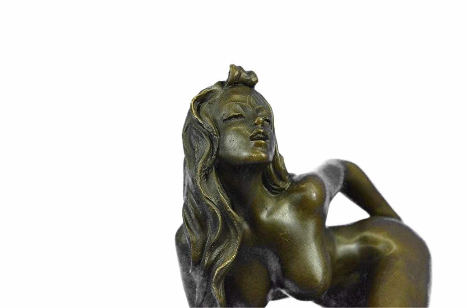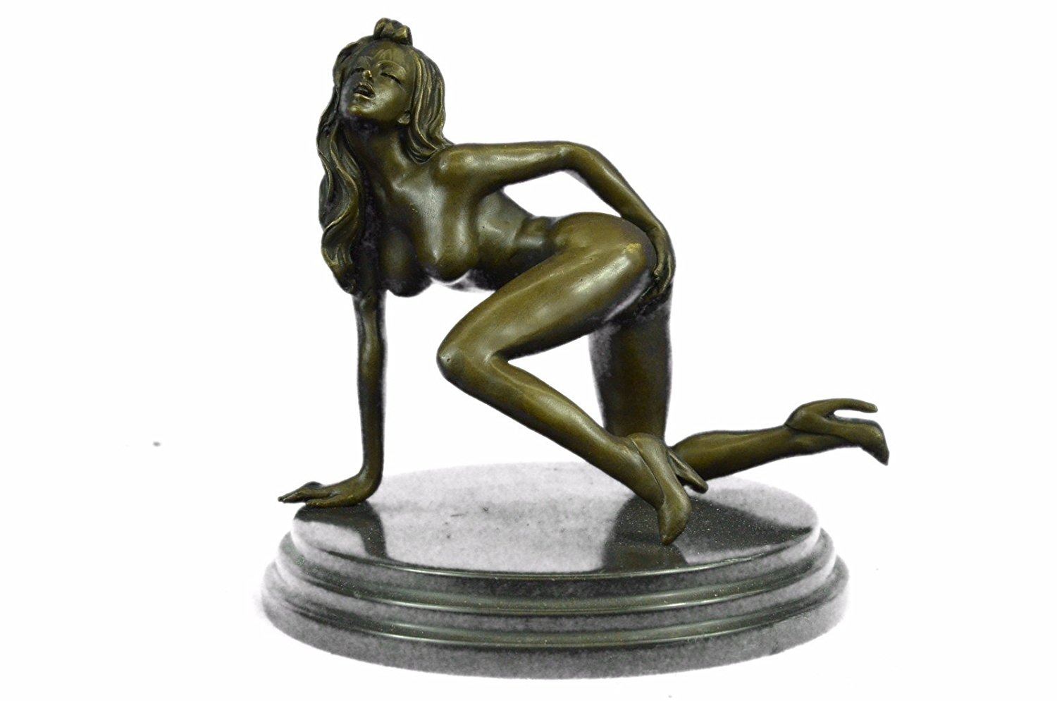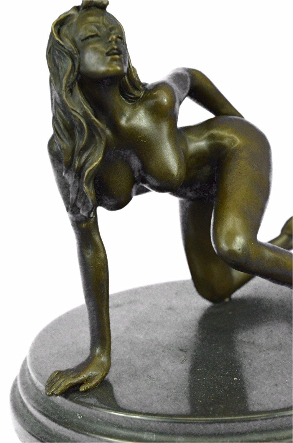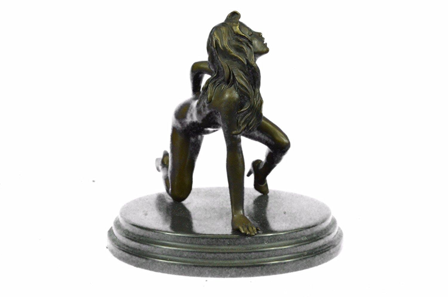 The nude seductress crawls on the ground in the grasp of a feverish desire. The bronze sculpture, capturing woman sexuality, was cast using the early method of lost-wax casting and stained with a brown patina finish for preservation. This sculpture is mounted upon a black marble base. Bronze Dimensions with Marble Base: Height 8 X Width 8 inches. Weight: 7 LBS. Inventory: 79ST0804497