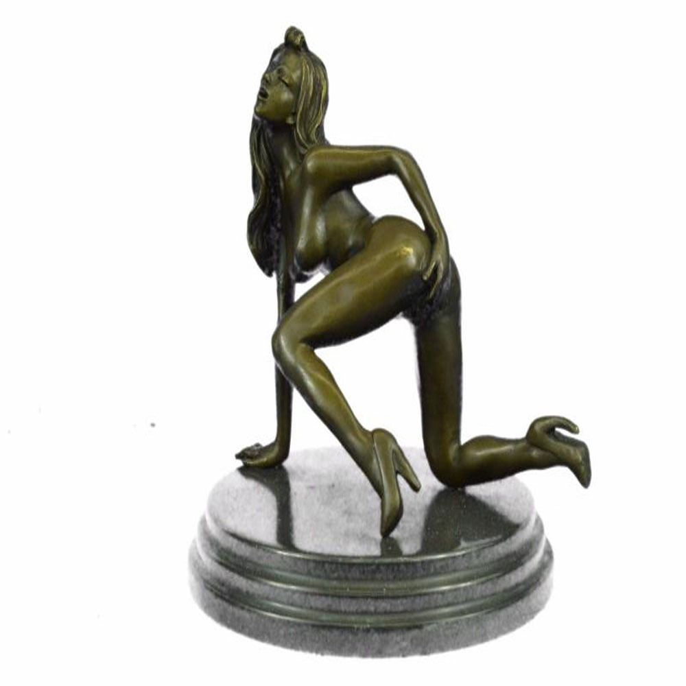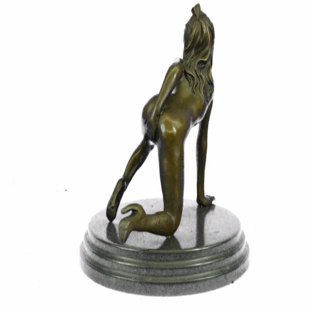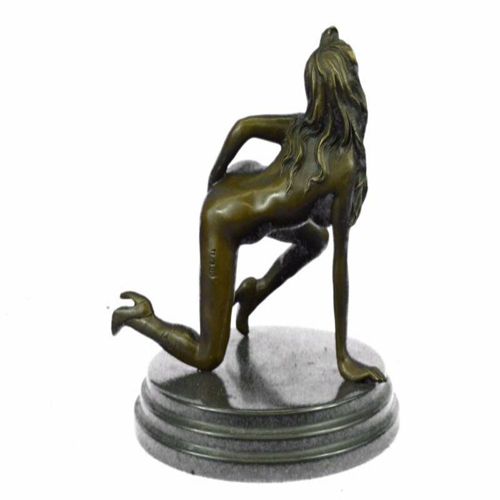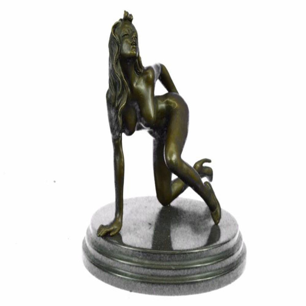 The nude seductress crawls on the ground in the grasp of a feverish desire. The Bronze Sculpture, capturing woman sexuality, was cast using the early method of lost wax casting and stained with a brown patina finish for preservation. This Sculpture is mounted upon a black marble base. Bronze Dimensions with Marble Base: Height 8 X Width 8 inches. Weight: 7 LBS.