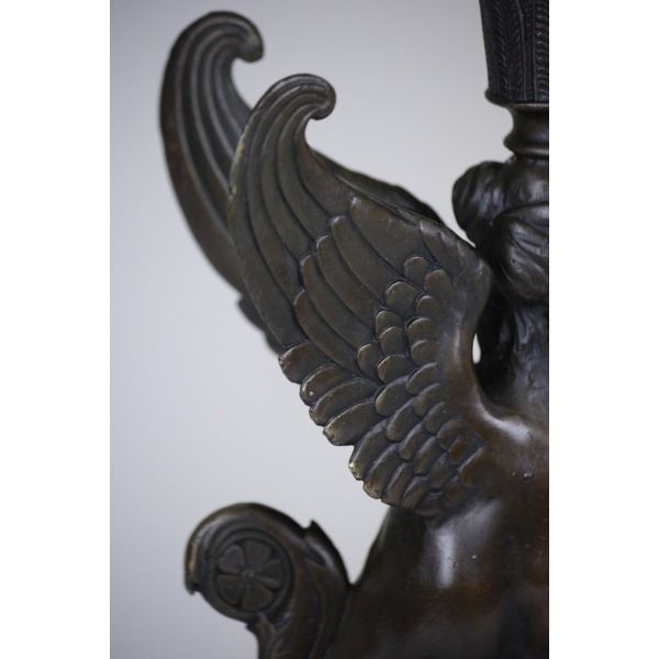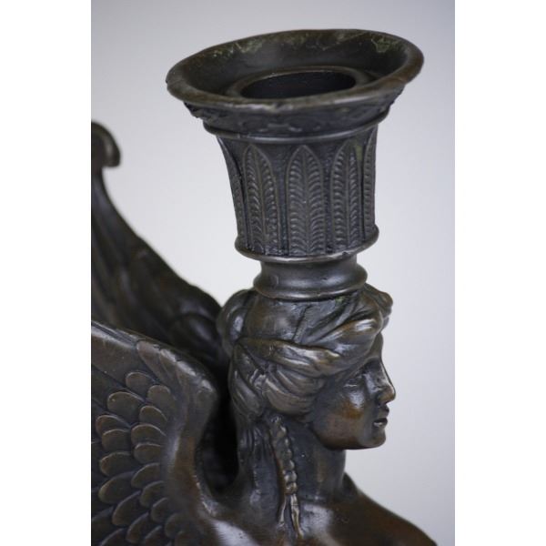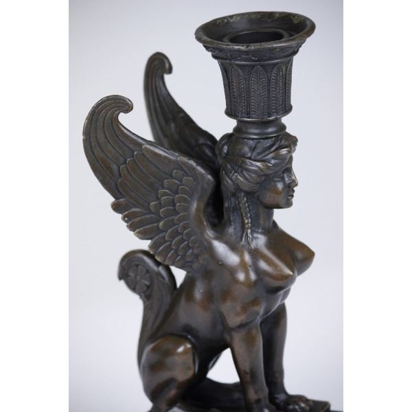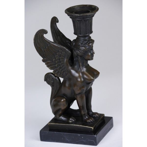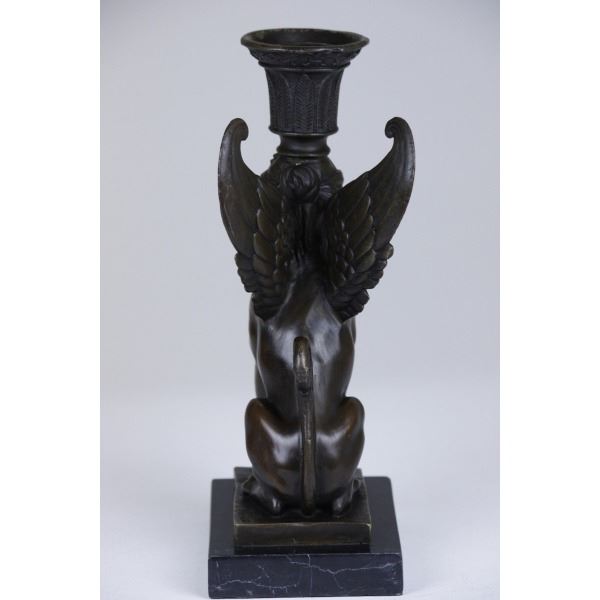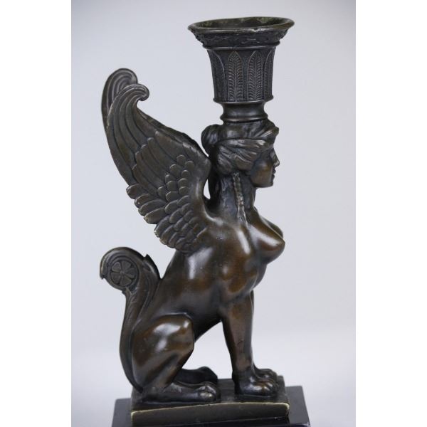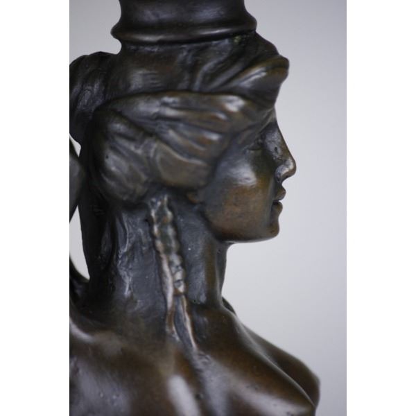 A fine hand-tooled bronze created from wax casting and finished in a dark brown polish enhances the beauty of the art. Her skin tones with a golden bronze finish, her voluptuous figure is accented by her lovely face is graced with her long hair tresses. She holds above her head the candelabra fixture. Dimensions: Height 9 X Width 4 inches. Weight: 6 LBS.