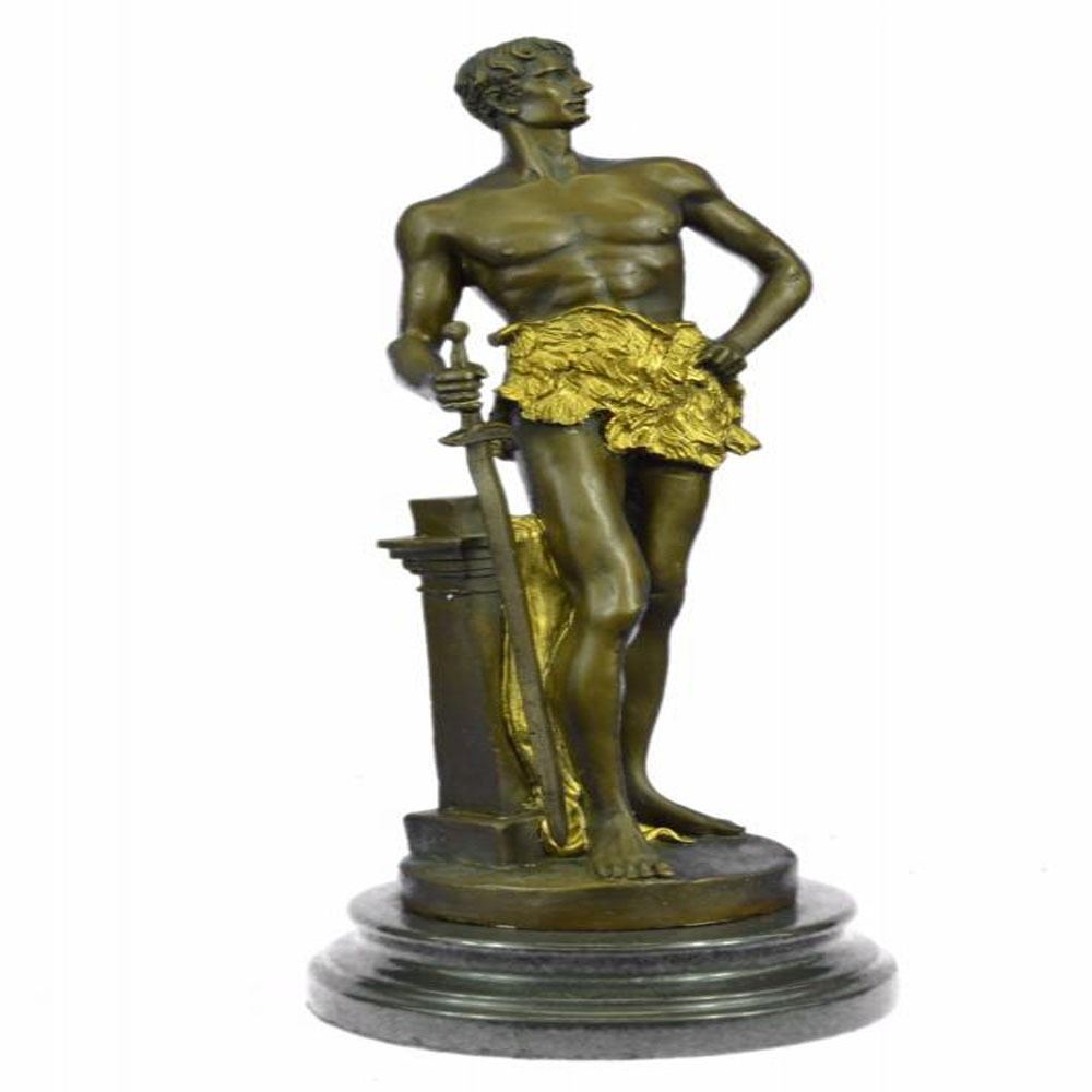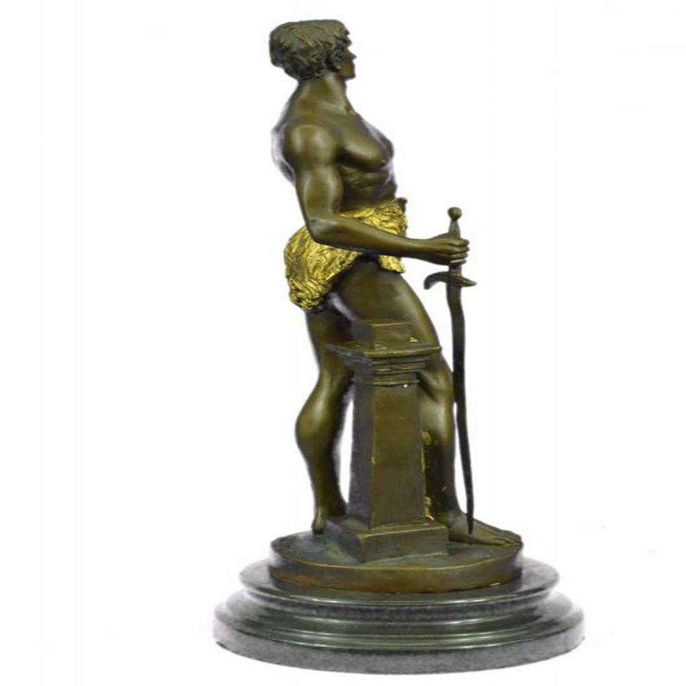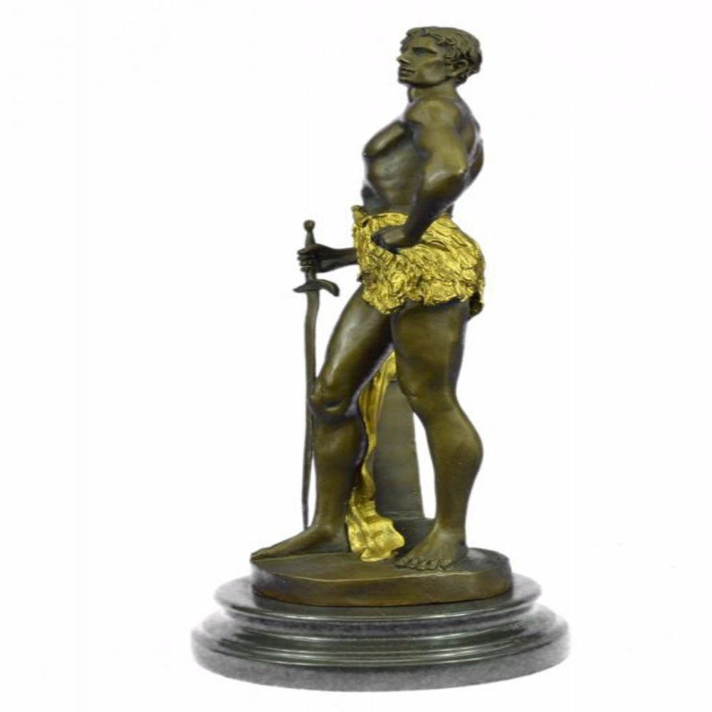 Bronze Sculpture of a semi nude man holding sword. The handmade Bronze Sculpture was cast using the archaic method of lost wax casting and stained with a brown and gold patina finish for perpetuation. He is mounted upon a marble base. Bronze Dimensions with Marble Base: Height 15 X Width 6 inches. Weight: 9 LBS.