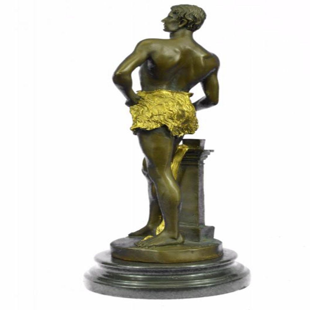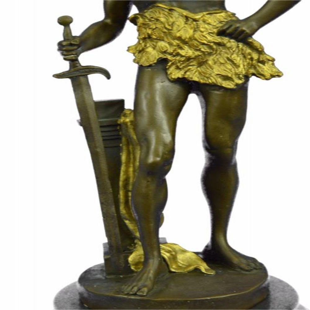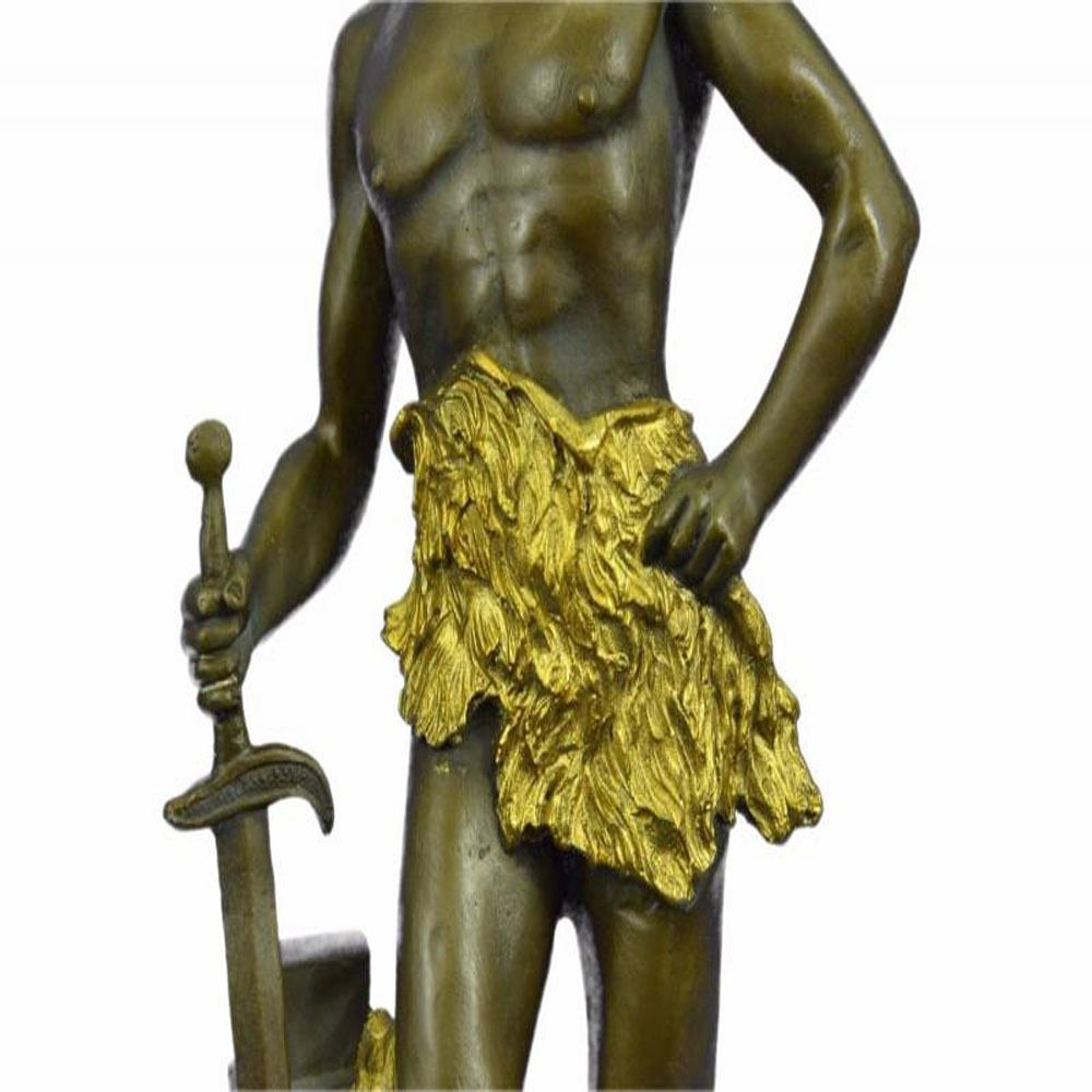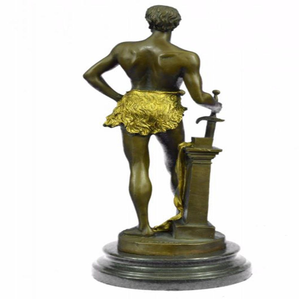 Bronze Sculpture of a semi nude man holding sword. The handmade Bronze Sculpture was cast using the archaic method of lost wax casting and stained with a brown and gold patina finish for perpetuation. He is mounted upon a marble base. Bronze Dimensions with Marble Base: Height 15 X Width 6 inches. Weight: 9 LBS.