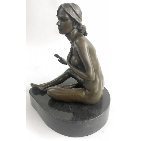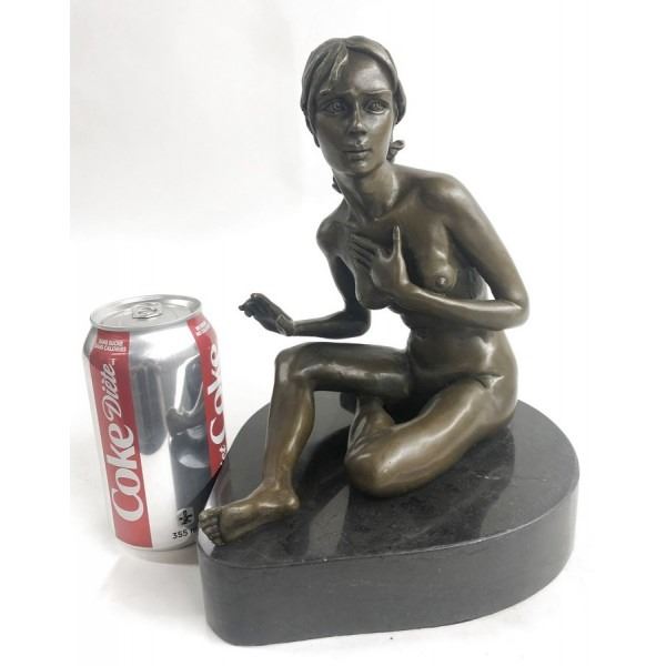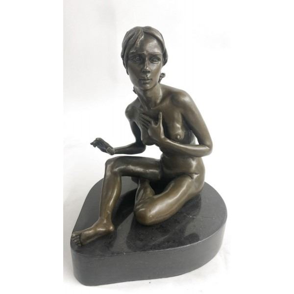She poses for a painting, sitting before his easel wearing nothing but her curves. She is a natural woman and she sits innocently awaiting his instruction. Her curly hair barely reaches her shoulders. She tucks her feet to the side and smiles. This brown patina sculpture was cast using the Lost Wax Method and is mounted on a marble base. Dimensions: Height 10 X Width 8 inches. Weight: 13 LBS.