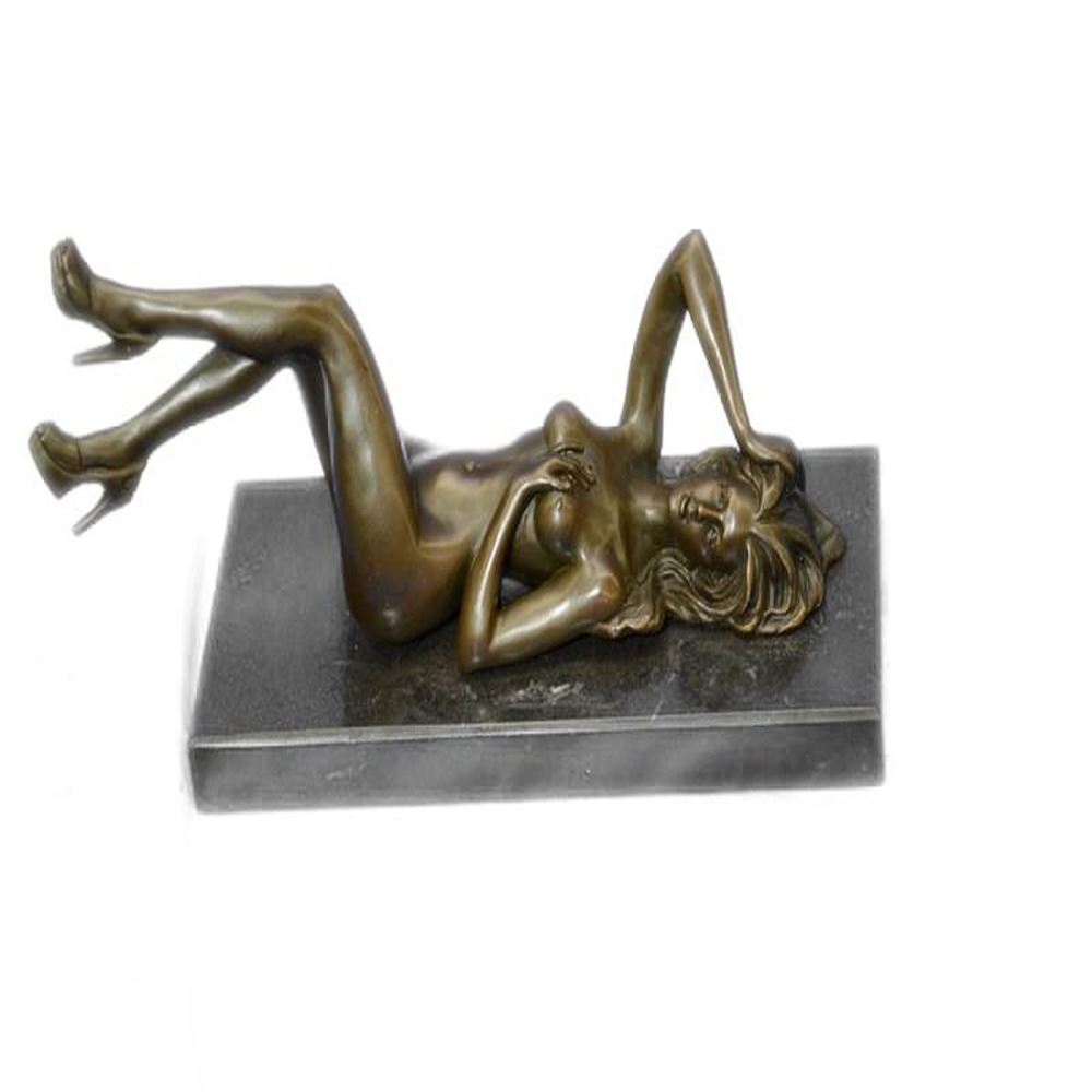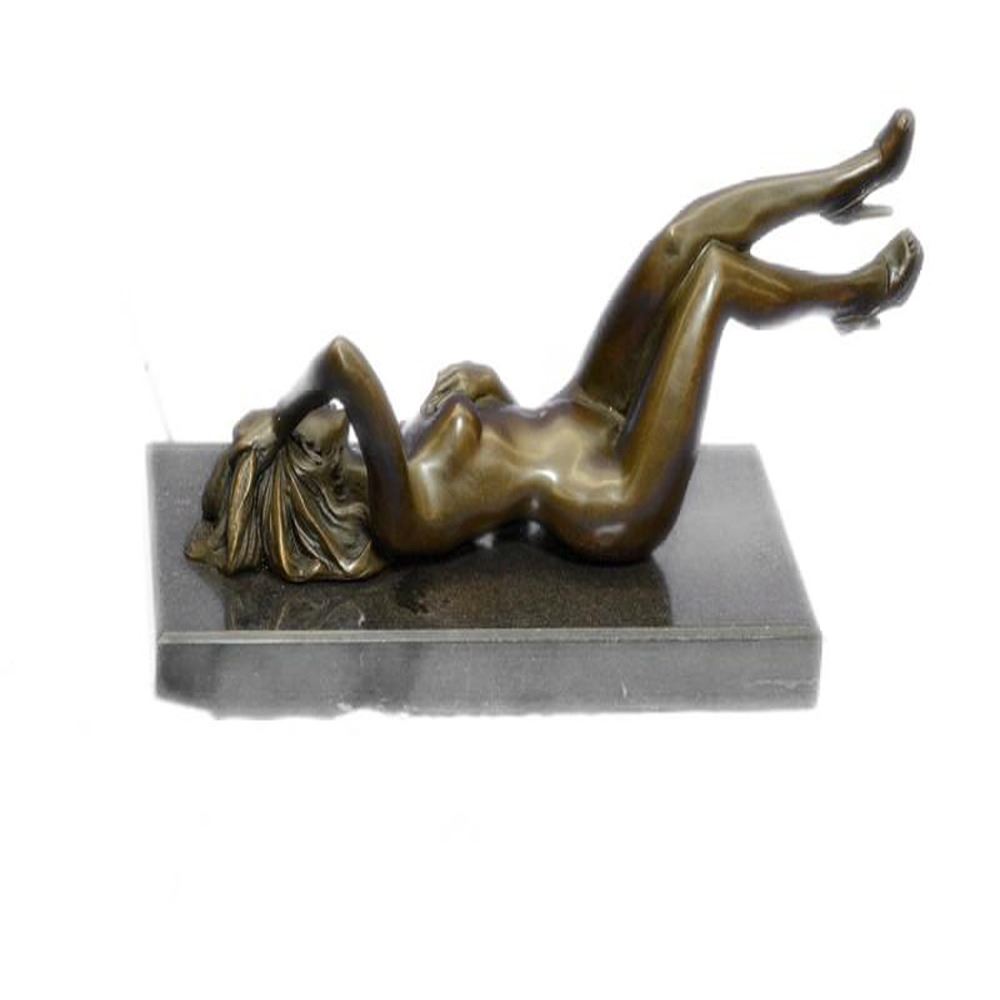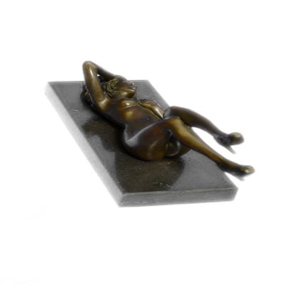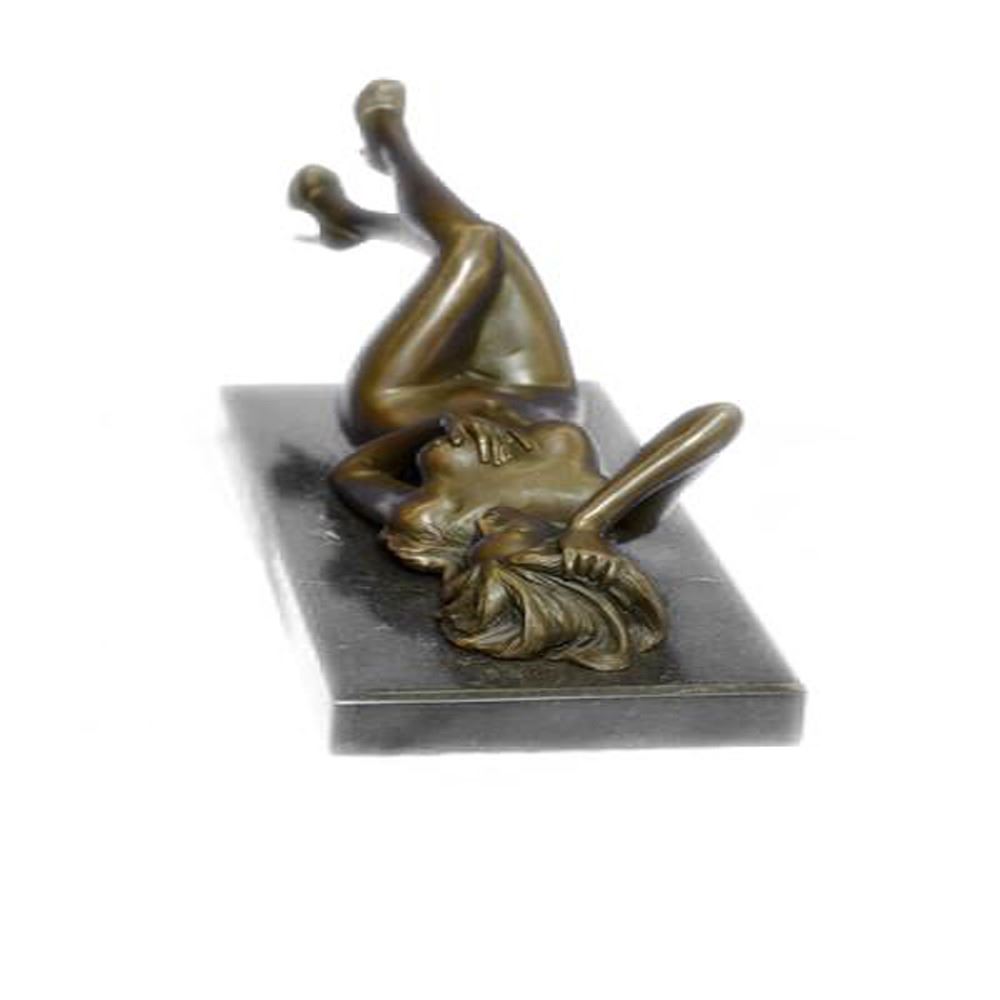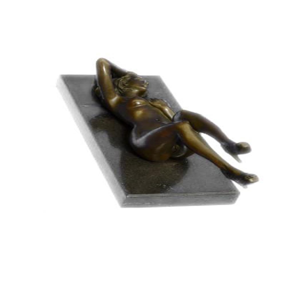 This Sculpture of a nude woman will go beautifully put in any room of the house or as a gift. She lays on her back as she daydreaming. As she holds her erotic pose she smile gracefully with her warming and delightful smile she brings you in wondering what it is shes doing and thinking. This confident woman was cast using the Lost Wax Method. 100% handmade Bronze and carefully detailed. Bronze Dimensions with Marble Base: Height 5 X Width 10 inches. Weight: 5 LBS.