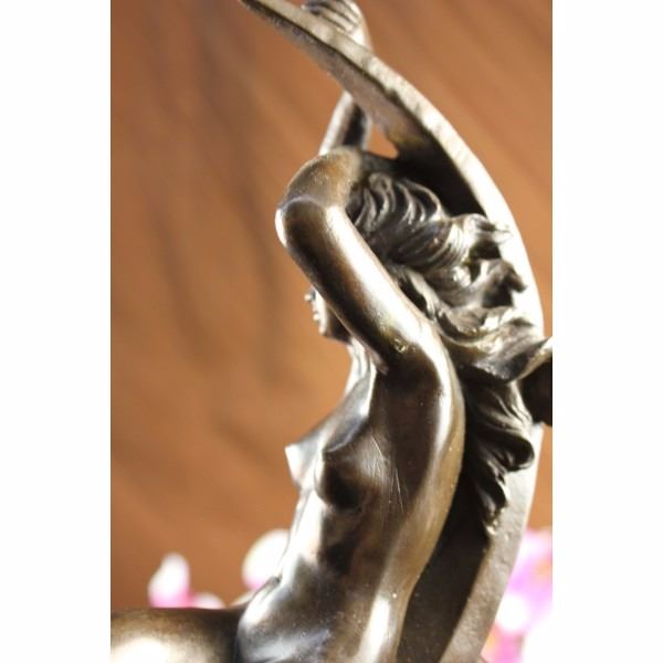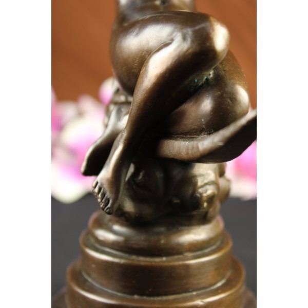 The 100% bronze sensual woman sits upward, extending her arms in the air with her legs crossed. Her arms wrap around her head in a grasp of fervor. Her furrowed brow and closed eyes signify her unrelenting passion. The skin tone on her beautifully formed body is coated in a brown patina finish. This nude, voluptuous woman was molded using the thousand year old method of lost-wax casting and mounted upon a hexagonal, black marble base. Bronze dimensions with marble base: Height 11 X Width 8 inches. Weight: 5 lbs.