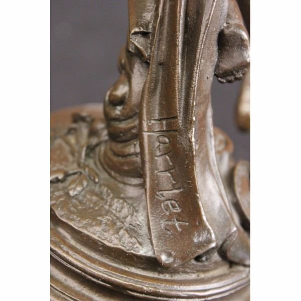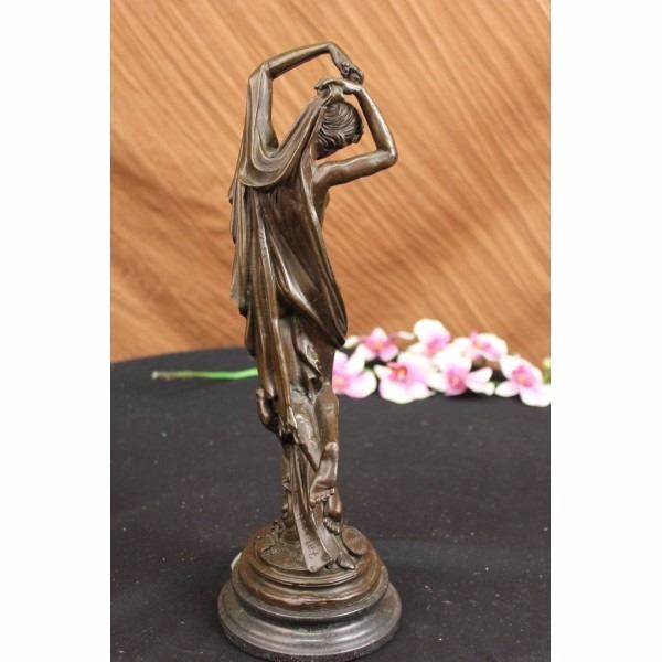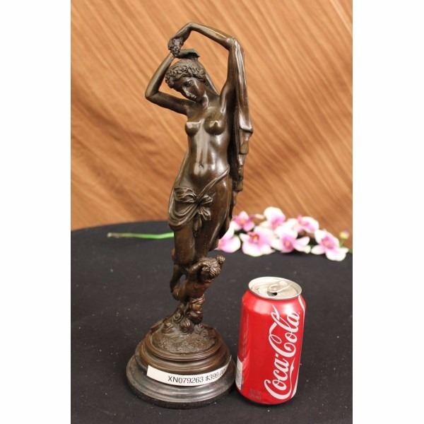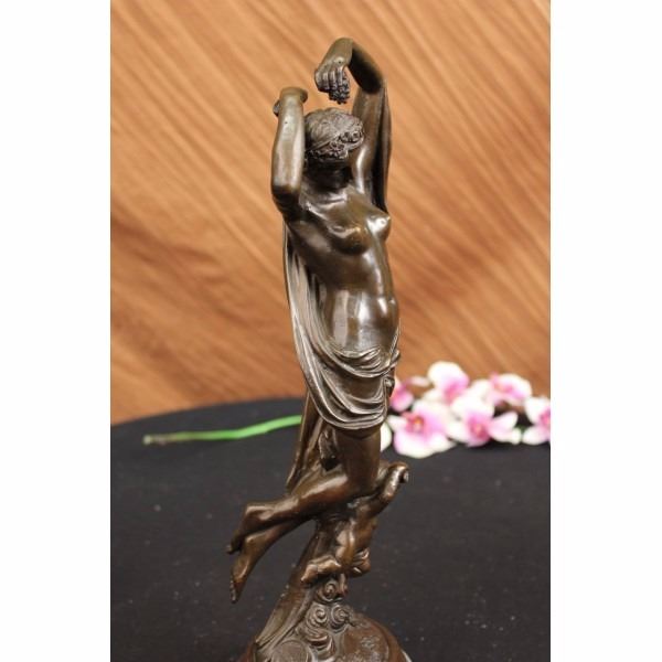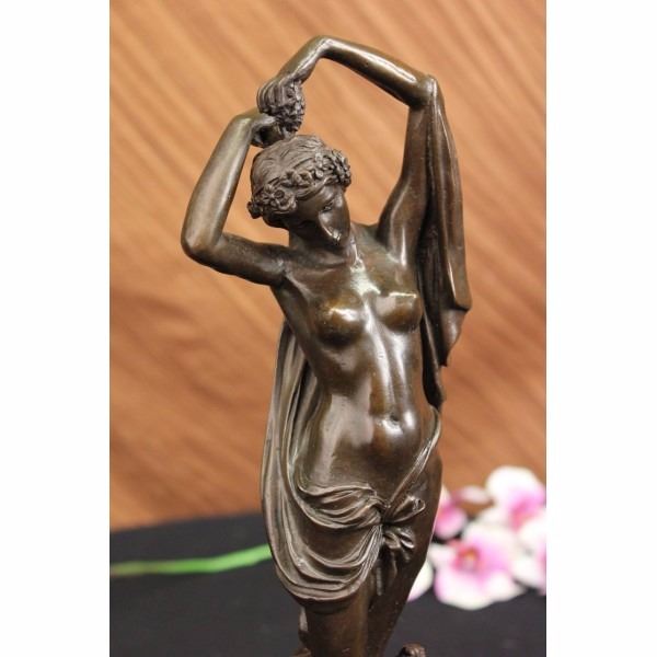 This Bronze Nymph-Like Woman Stands Posed Contapposto Regaining Her Serenity Through Mother Nature. She Extends Her Both Arms Over Her Head Trying To Keep Her Gained Peace And Wisdom Within Her Heart. She Stares Out Silently And Is Still Even Though The Wind Moves Her Hair And Small Cloth All About Her. She Is Found On Top Of A Child With A Saddened Look On Her Face. The Cast Capturing Feminine Beauty And Her Failure To Have A Child Is Mounted Atop A Black Marble Base With The Signature Of The Artist Harriet. This Brown Patina Sculpture Was Molded By Using The Thousand Year Old Method Of Lost-Wax Casting; Ensuring An Exquisite Piece Of Art With Integrity To Last For Ages Of Admiration.The Handmade Bronze Sculpture Was Cast Using The Archaic Method Of Lost-Wax Casting And Stained With A Brown Patina Finish For Perpetuation. She Is Mounted Upon A Black Marble Base. Bronze Dimensions With Marble Base: Height 15 X Width 5 inches. Weight: 9 Lbs.