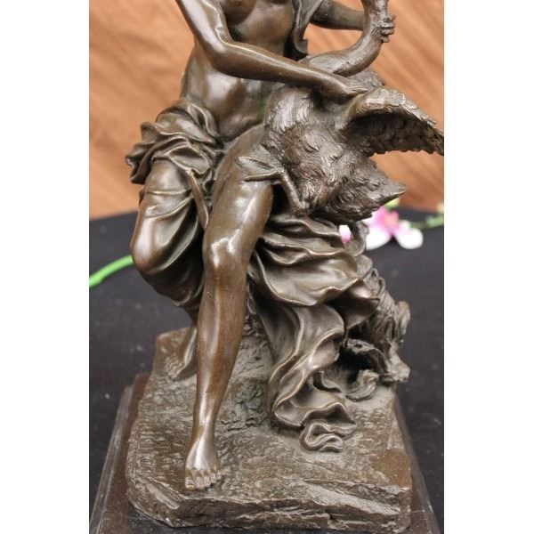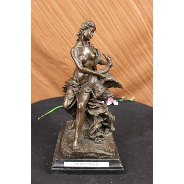 This is bronze sculpture is of leda and the swan which is a motif from greek mythology in which zeus came to leda in the form of a swan. the story goes that zeus took the form of a swan and raped or seduced leda on the same night she slept with her husband king tyndareus. according to later greek mythology, leda bore helen and polydeuces, children of zeus. leda is seen seated as with both hands, she caresses his neck, in complete resignation to the stare of the seducing god zeus, as with his beak he lets fall the robe from her shoulders. the sculpture was cast using the archaic method of lost-wax casting and finished with a brown patina stain for preservation. it is mounted upon a black marble base. Bronze dimensions with marble base: Height 17 X Width 8 inches. Weight: 23 lbs. Please Note: This is a reproduction bronze sculpture from the original molded and signed. This featured bronze sculpture is a recast after the original, and has been done recently. This 100% bronze sculpture is an abstract piece certain to be a conversation piece.
