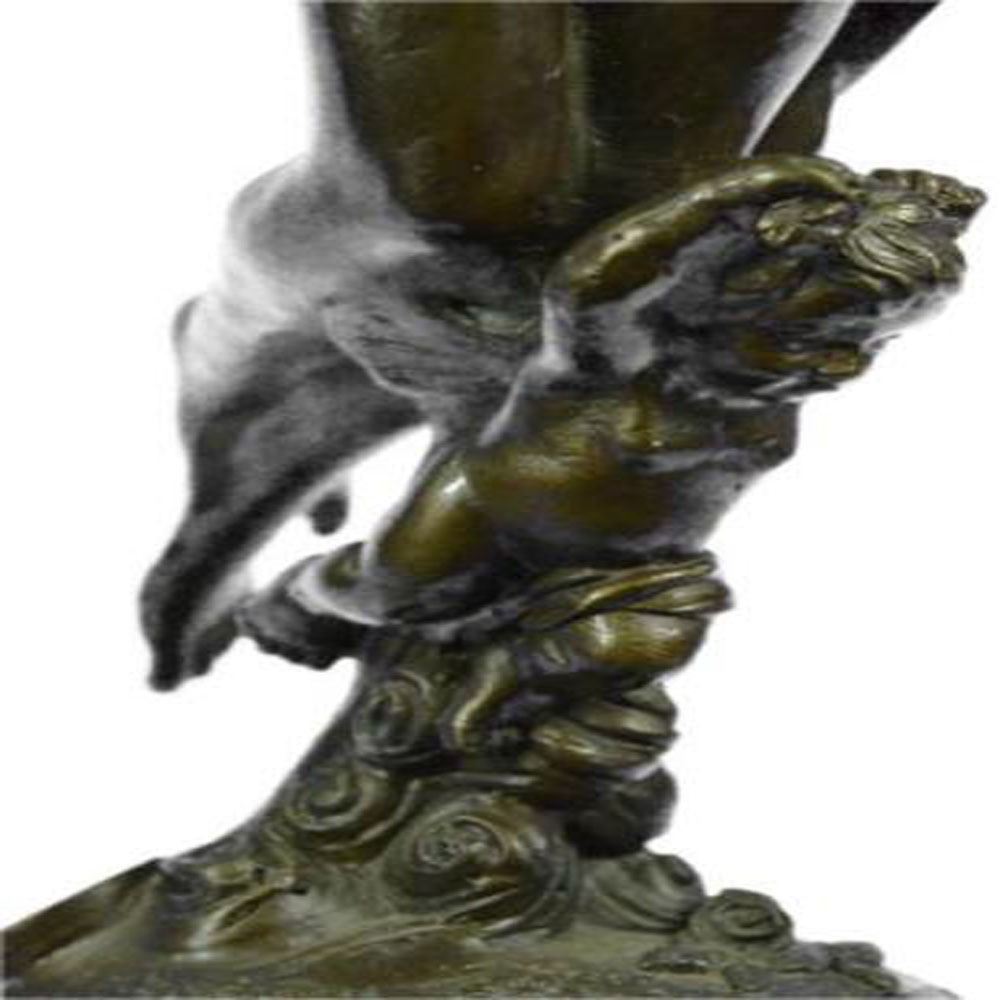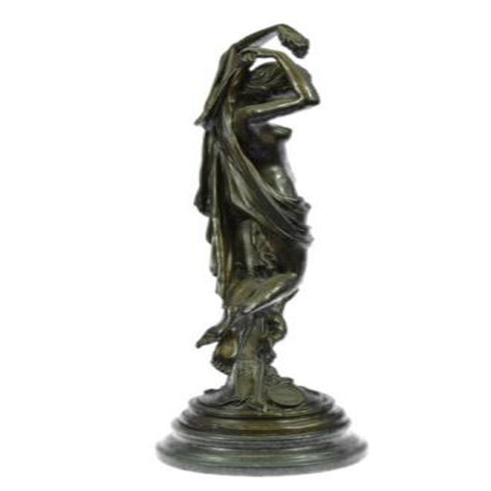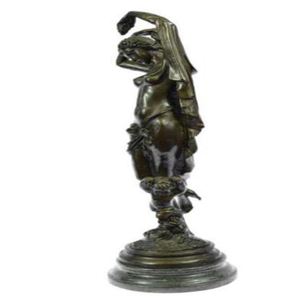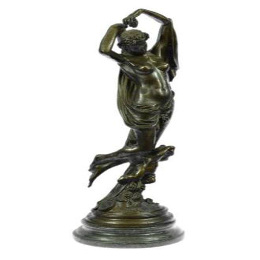 This Bronze nymphlike woman stands posed contapposto regaining herserenity through mother nature. She extendsher both arms over her head trying to keep her gained peaceand wisdom within her heart. She stares out silently and is stilleven though the wind moves her hair and small cloth all about her.She is found on top of a child with a saddened look on her face. Thecast capturing feminine beauty and her failure to have a childis mounted atop a marble base. This brown patina Sculpture was molded by using the thousand year old method of lost wax casting and ensuring an exquisitepiece of art with integrity to last for ages of admiration. Bronze Dimensions with Marble Base: Height 15 X Width 5 inches. Weight: 9 LBS.