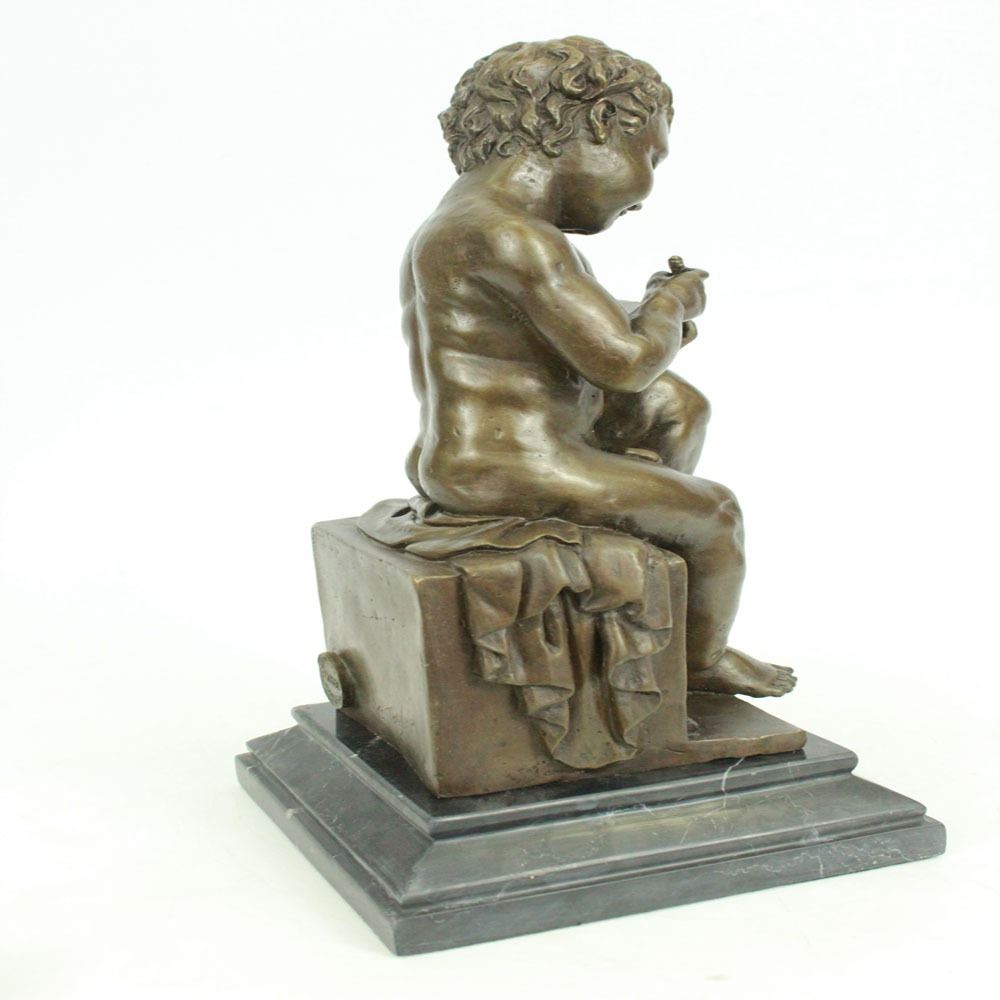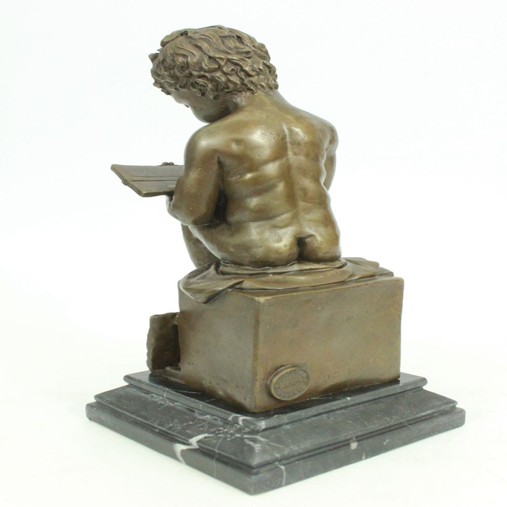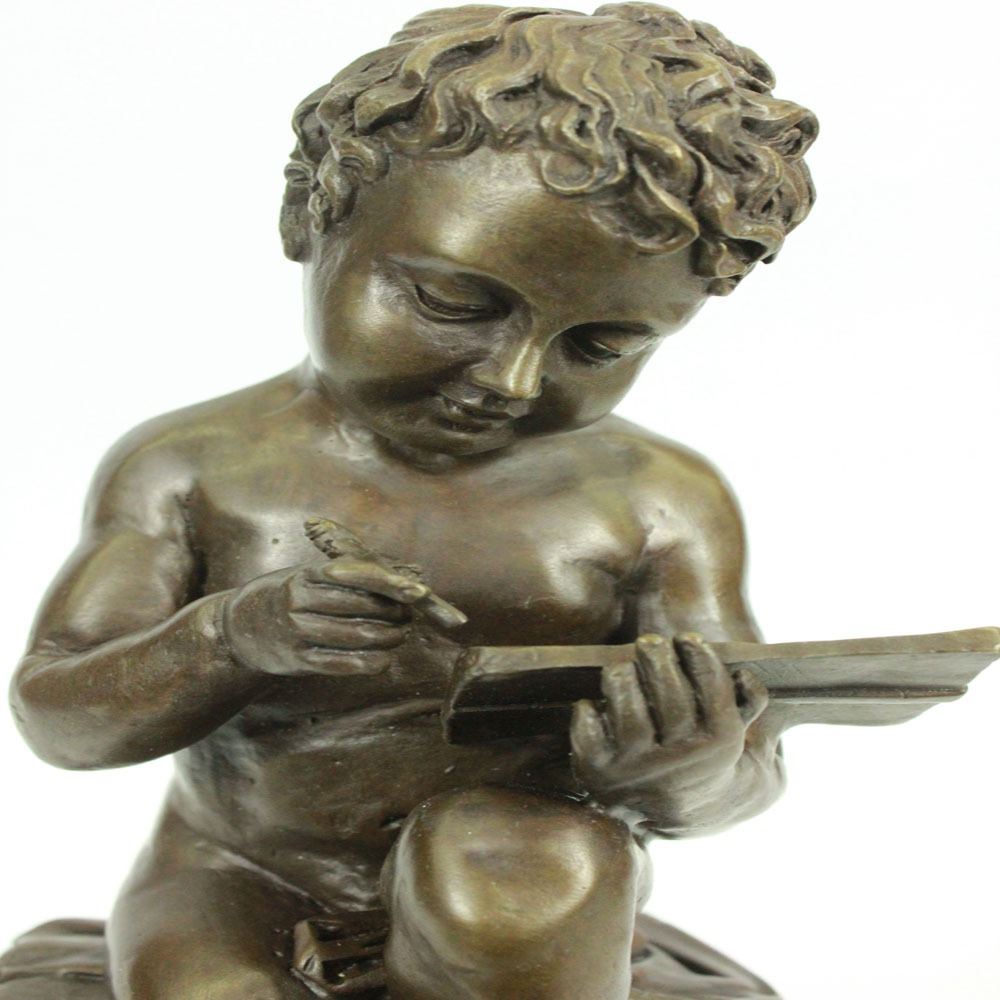 This cute little boy appears like a businessman sitting with a pen book in hand. A briefcase leans behind his feet. A little smile on his mouth as he writes his notes. His garments rest on his seat. The cute and inspiring Sculpture was crafted using the lost wax method and it rests on a marble base. Bronze Dimensions with Marble Base: Height 11 X Width 5 inches. Weight: 10 LBS.