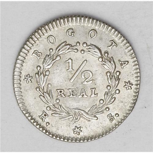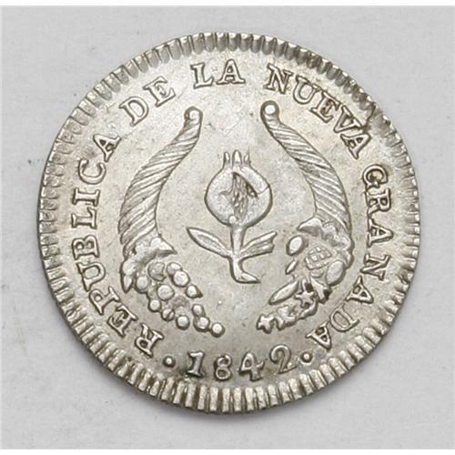 <B>Nueva Granada 1/2 Real 1842-RS Bogota, </B></I>KM96.1, lightly toned AU-UNC with abundant mint luster. The strike is sharp and attractive. Rare grade for this type.