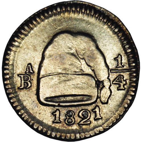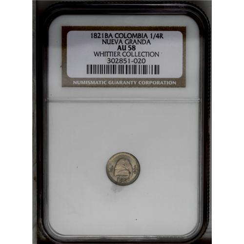 <B>Nueva Granada 1/4 Real 1821-Ba, </B></I>KM79.2, AU58 NGC, perfectly struck with subtle gray-gold patina over lustrous surfaces, an unusually attractive little coin in very rare condition.