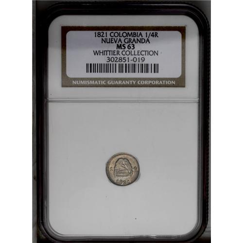 <B>Nueva Granada 1/4 Real 1821, </B></I>KM79.1, MS63 NGC, very rare type without the Ba mintmark, sharply detailed with choice gray patina over full mint bloom, the reverse displays two light planchet laminations. Extremely rare quality and believed to be the finest known.