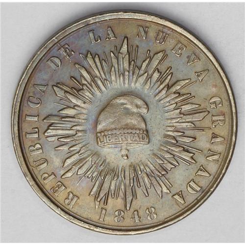 <B>Nueva Granada Decimo 1848, </B></I>KM102, XF, cleaned long ago and now toned, some noticeable surface marks on the reverse.