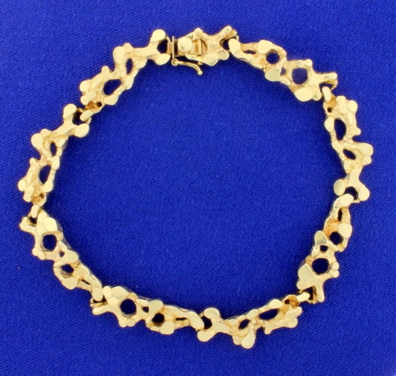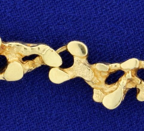 In 14K yellow gold, the bracelet is 8 1/2 inches long and is 9-10mm wide, has a safety clasp. 34.2g