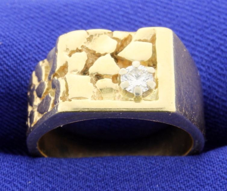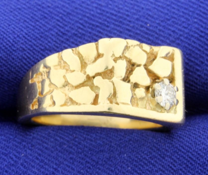 Attractive 14k yellow gold nugget style ring with a 1/4 carat diamond. The diamond is brilliant cut VS clarity and G color. There is almost 1/2 oz. of 14k gold in this ring! Size 10 14.3g