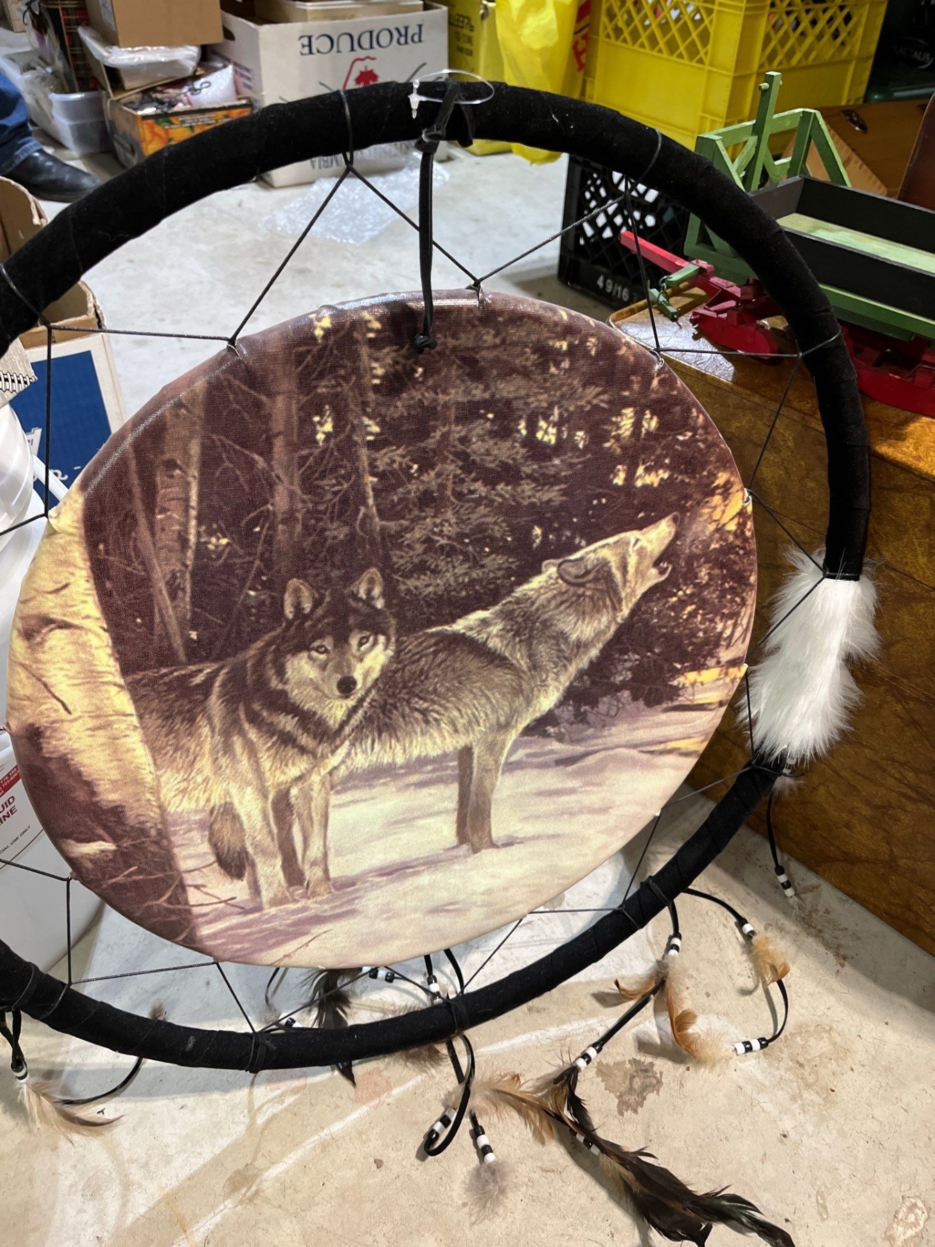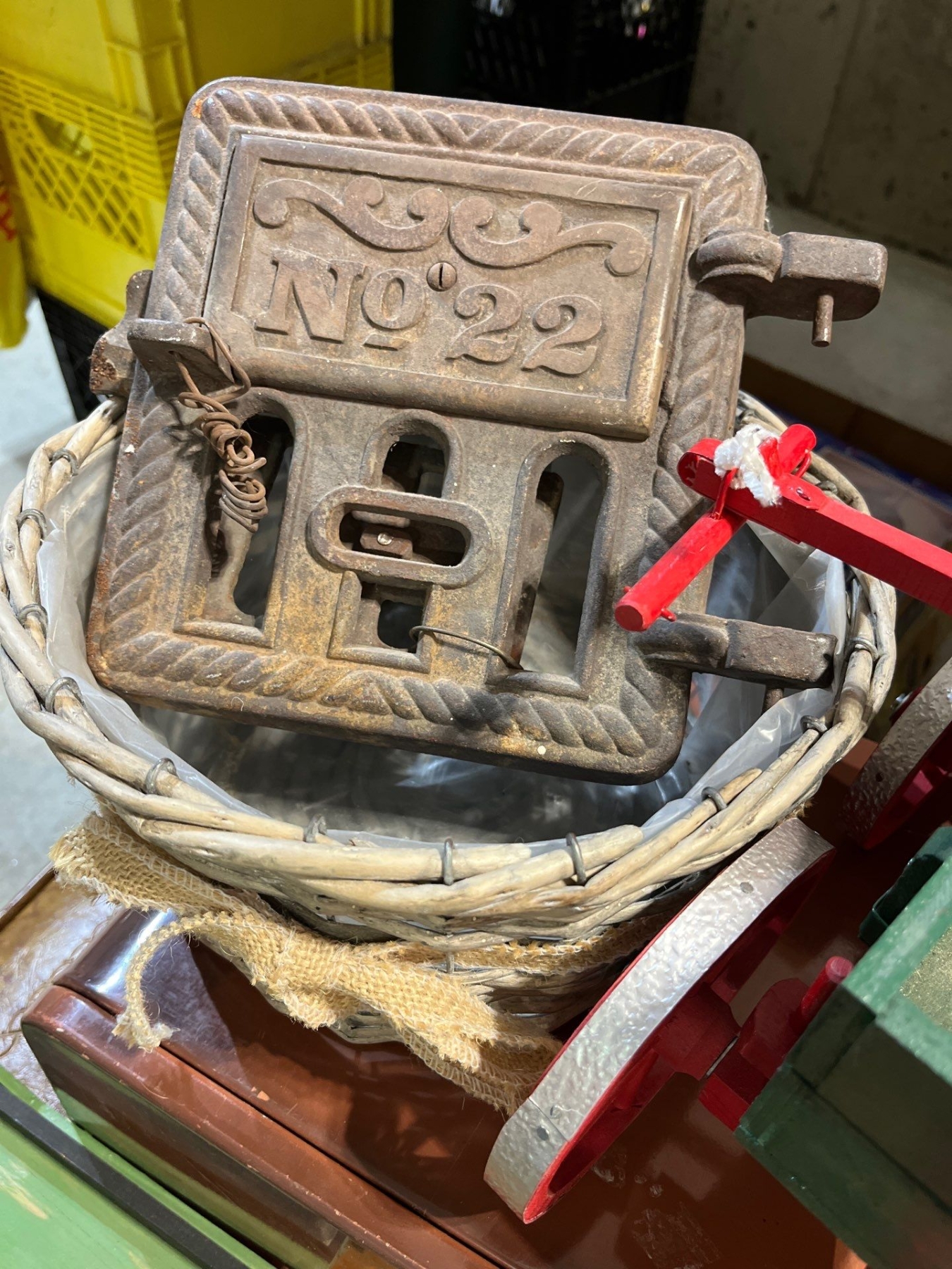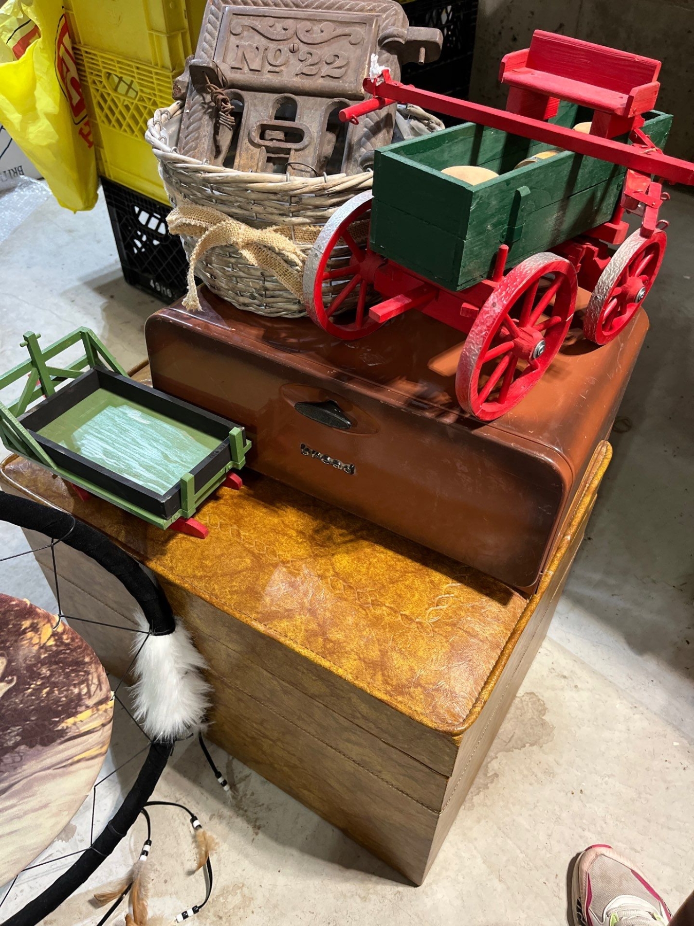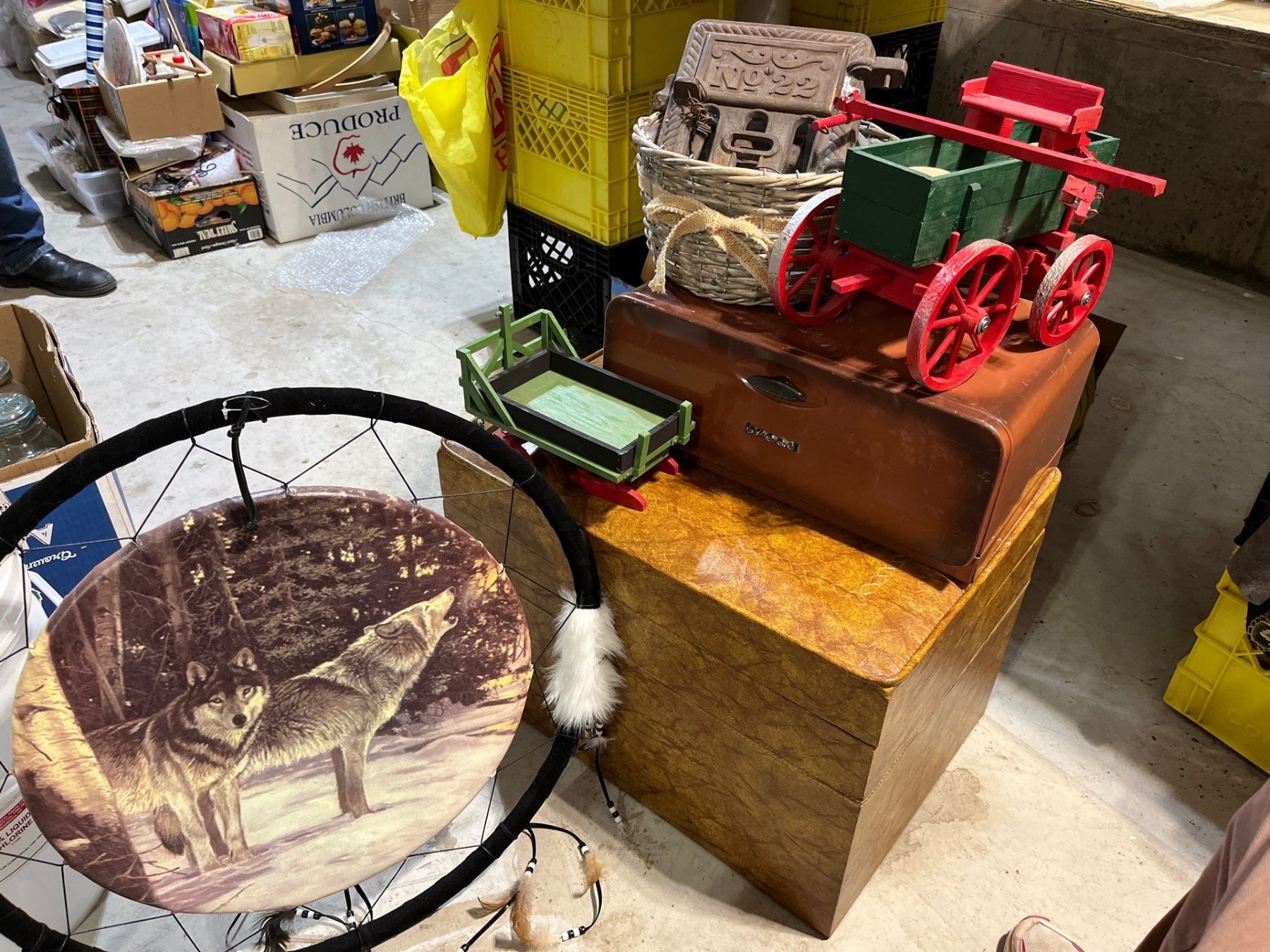 Number of vintage items, including a vintage bread, box a little horse drawn, winter sleigh and basket with the front of a number 22 heater and vintage brown foot rest storage box and a large Dreamcatcher to catch all those dreams
