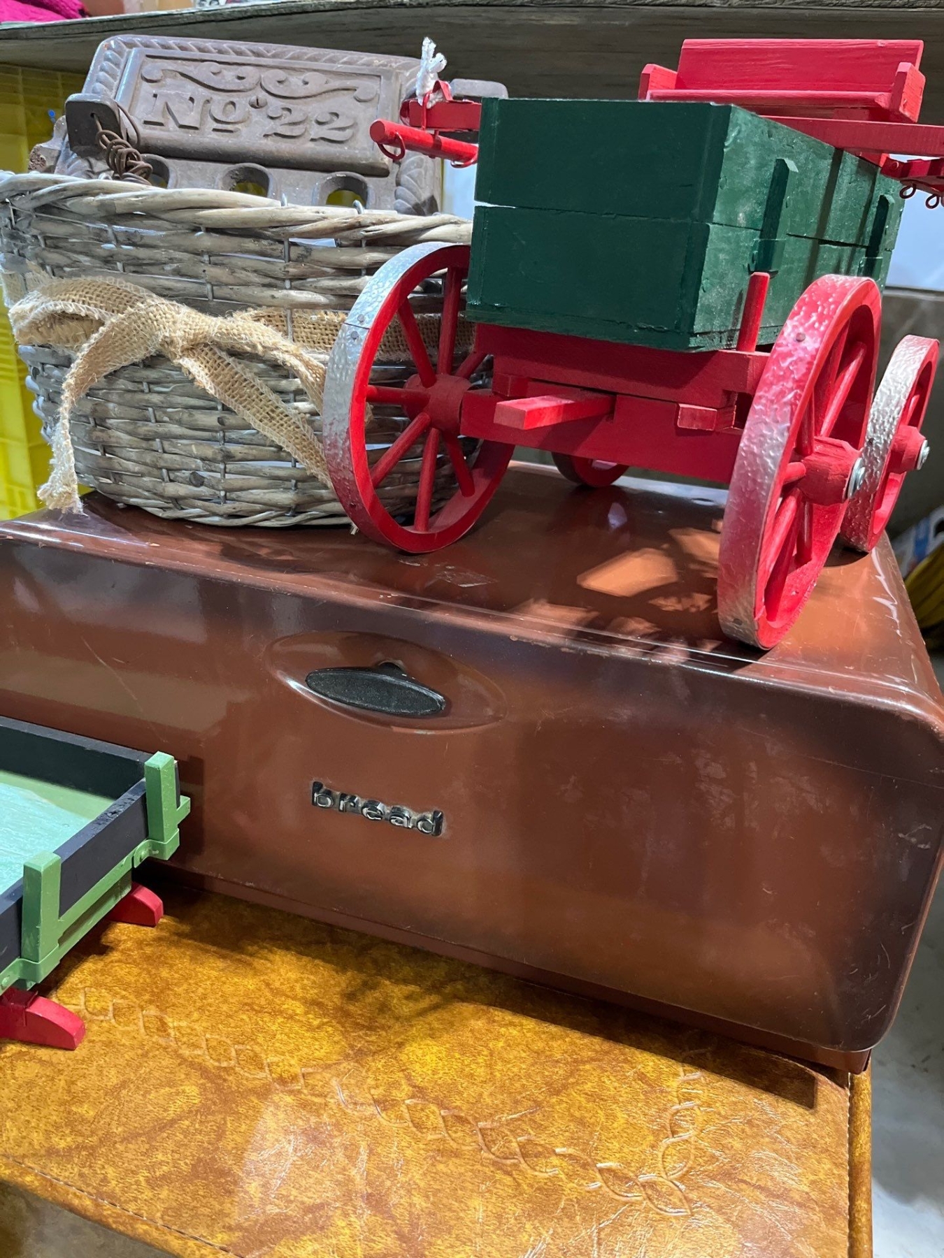 Number of vintage items, including a vintage bread, box a little horse drawn, winter sleigh and bas
