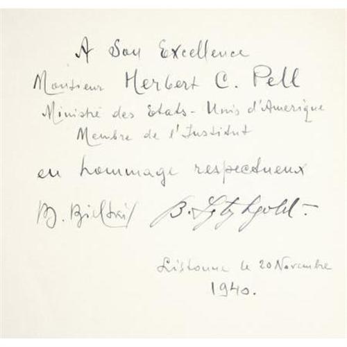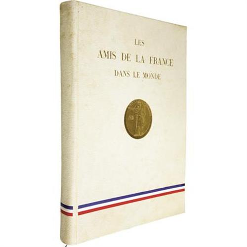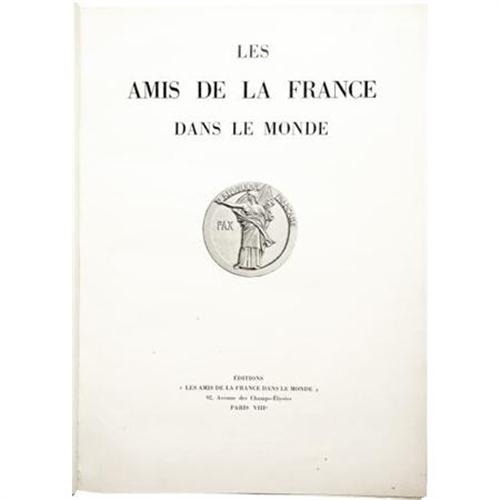 <B>Numbered Edition of <I>Les Amis de la France Dans Le Monde</B></I></B></I> (Paris: Les Amis de la France Dans Le Monde, 1939), first edition, 335 pages, cream cloth with gilt titles, a gold medallion in the center of the front cover, and a red, white & blue ribbon at the bottom of same, folio (11" x 15"), glassine wrap, housed in an original issue gate-fold box with a title stamp on the front and a red, white & blue ribbon tie. Numbered 27 of 500 first edition copies. A bookplate for previous owner Herbert Claiborne Pell, Jr. is affixed to the front pastedown. Pell was a Congressman from New York and one of the main proponents for the United Nations War Crimes Commission after World War II. Additionally, the book has been specially presented to Pell, evidenced by a stamp on the colophon / copyright page and a gift inscription by B. Bielski and Paul Reboux (presumably the publishers) on the front flyleaf. The glassine cover shows wear, and has slightly discolored the boards in spots, and the book shows mild edge wear, else very good.<BR><BR><b>Shipping:</b> Books & Catalogs (<a target="_blank" href="http://www.heritageauctions.com/common/shipping.php">view shipping information</a>)