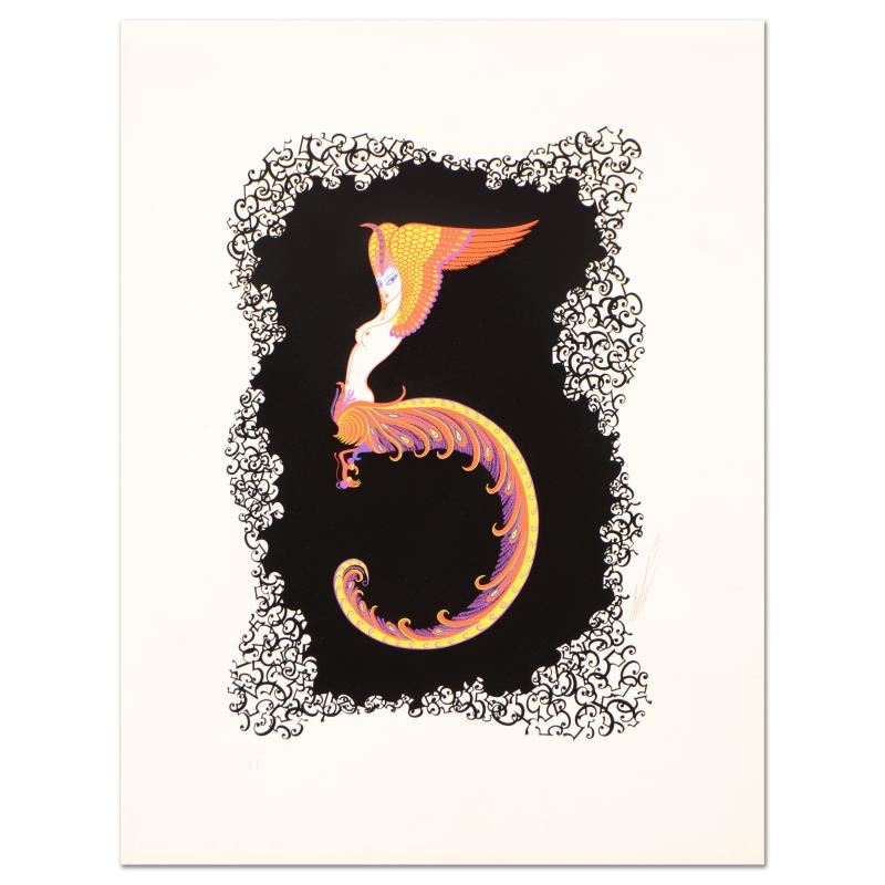 "Numeral 5" is a limited edition serigraph on paper by Erte (1892-1990), numbered and hand signed by the artist. Includes Certificate of Authenticity. Measures approx. 17" x 22.5" (border), 12" x 17" (image). Due to the age of this piece and the delicate nature of the paper it may have some slight imperfections.