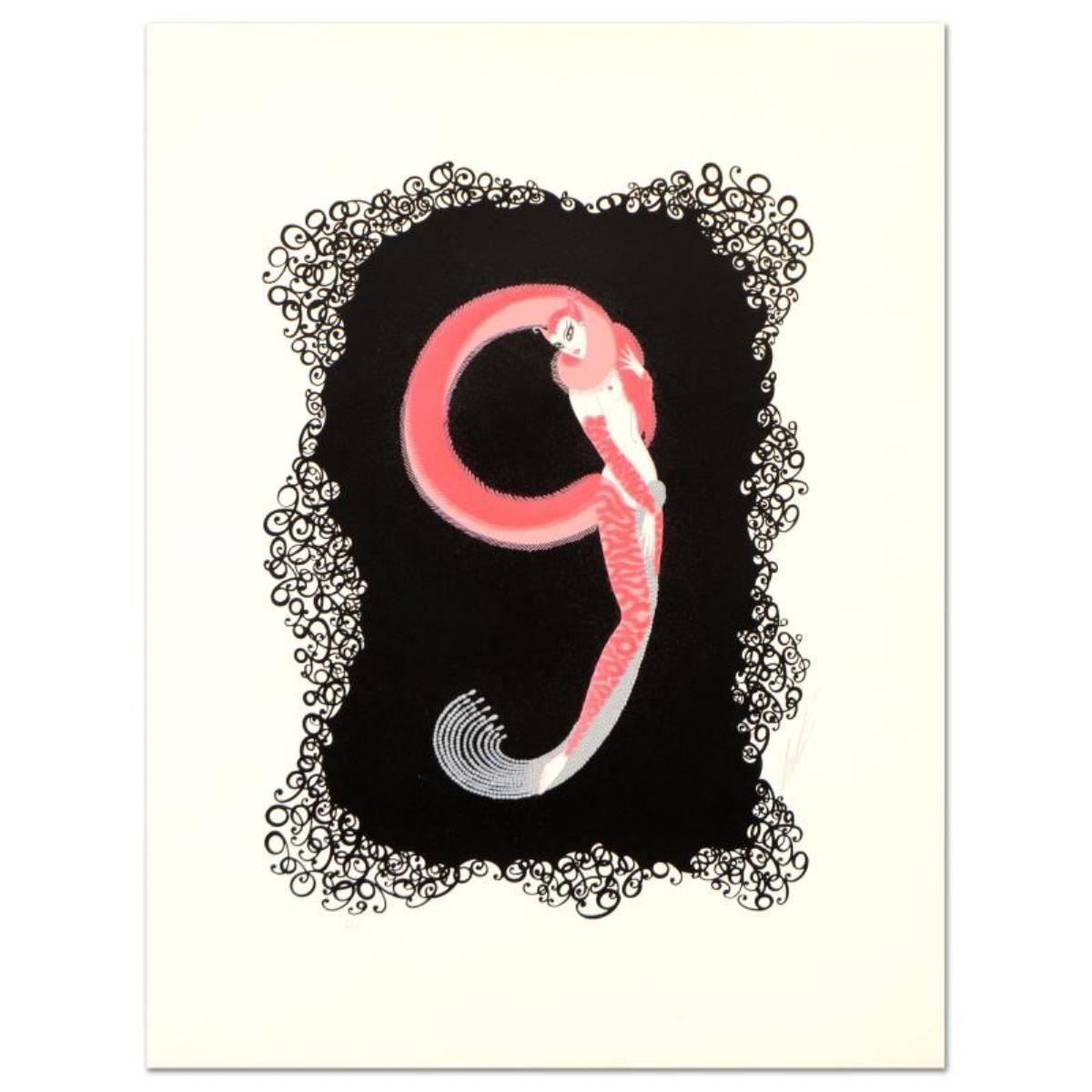 Numeral 9 by Erte (1892-1990). "Numeral 9" is a limited edition serigraph on paper by Erte (1892-1990), numbered and hand signed by the artist. Includes Certificate of Authenticity. Measures approx. 17.5" x 22.5" (border), 13" x 16" (image). Due to the age of this piece and the delicate nature of the paper it may have some slight imperfections.