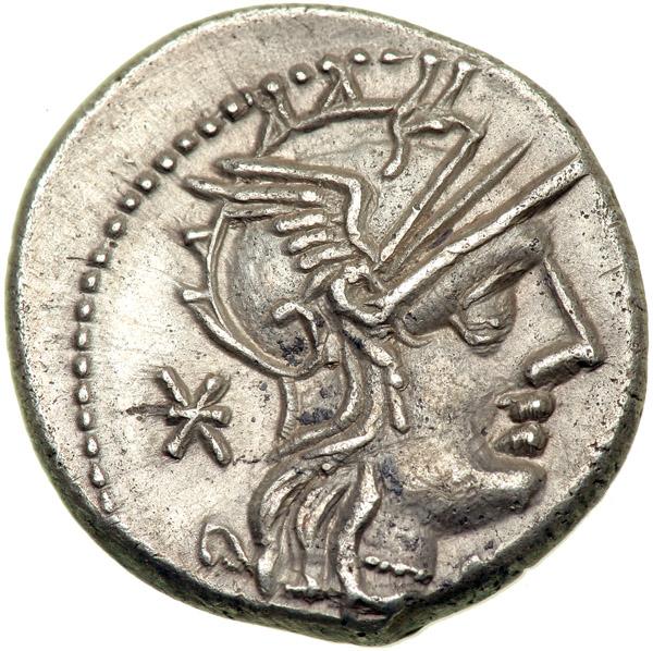 There are two varieties of this type — one with a control letter in lower right field, the other without the letter. Since the top of a letter is just visible below the chin on the obverse, we are attributing it to Crawford 268/1b .