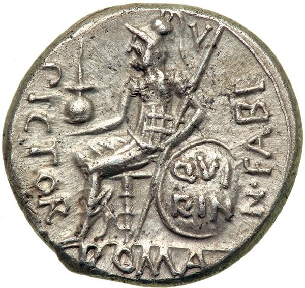 Numerius Fabius Pictor, moneyer. AR Denarius minted at Rome, c. 126 BC. Helmeted head right of Roma. Reverse: Q. Fabius Pictor seated left, inscribed shield at side. Fabia 11; Cr. 268/1b; Syd. 517a. Scarce. Unusually attractive; toned; Superb Extremely Fine. .