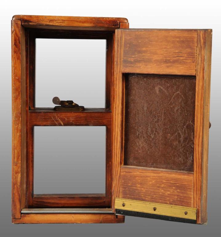 Description Circa 1920s. Door opens to reveal weather striping applied to the door threshold, windowsill, and working window frame. General overall light to medium wear, marks, and soiling. Condition (7.0 - 7.5, Very Good). Size 9" x 17" x 5".