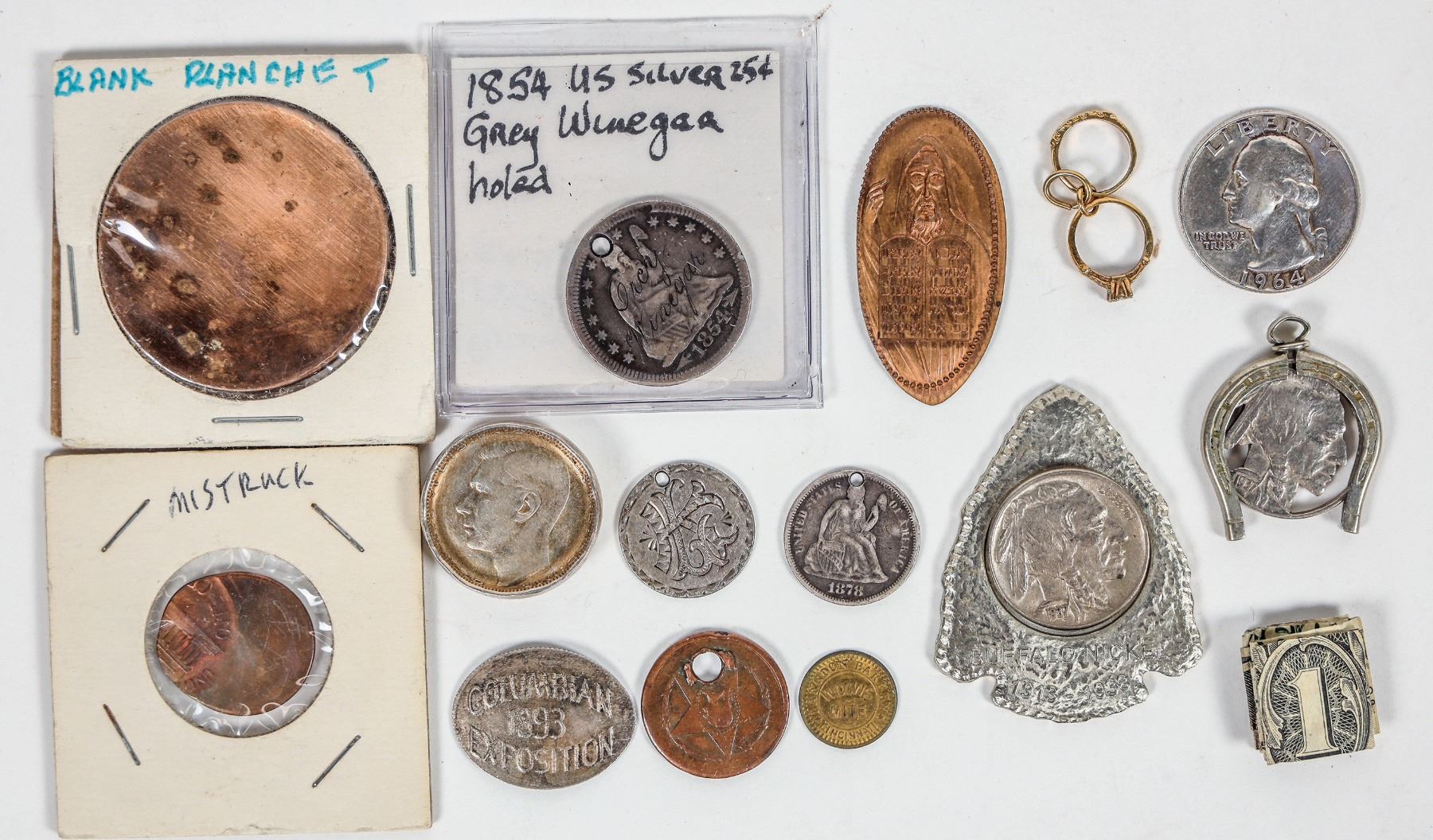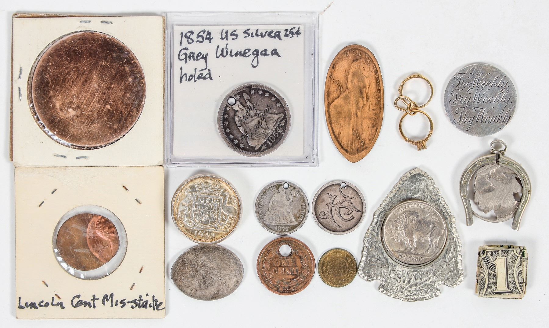 Miscellaneous: origami $1 bill; 38 mm copper blank planchet; Lincoln cent 60% off-center misstrike; 1854 Seated Liberty quarter counter stamped Gary Winegar; elongated penny ten commandments; Widow's mite Langdon Bakery; two infant rings, gold filled; 1943 foreign silver hammered into a ring; 1893 Columbian Exposition elongated dime; carved Buffalo nickel in a jewelry horse shoe; Buffalo nickel mounted in a metal arrowhead; 1878 Seated Liberty dime love token (holed); 1877 Seated Liberty dime love token (holed); George Washington one cent civil war cent (holed); 1964 Washington quarter with reverse carved with the three stages of Man's sex life: Tri Weekly / Try Weekly / Try Weakly.