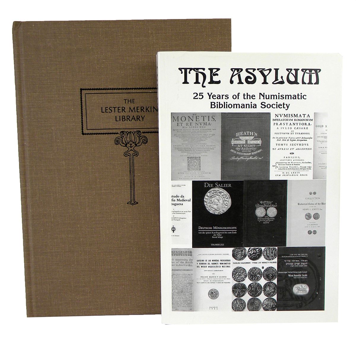 Numismatic Bibliomania Society. THE ASYLUM: 25 YEARS OF THE NUMISMATIC BIBLIOMANIA SOCIETY. Vol. XXII, No. 3. Np, 2004. 8vo, original pictorial card covers. (2), 75-339, (9), (2) pages, text illustrations. Fine. [with] Kolbe, George Frederick. THE LESTER MERKIN LIBRARY... New York, June 15, 1984. Small 4to, original brown cloth printed in black. 68, (4) pages; 350 lots. Prices realized list and estimate sheet laid in. Blindstamp; near fine. The Asylum issue was a special publication of over 250 pages, published in commemoration of the NBS’s 25th anniversary and featuring important articles by Dekesel, Cunnally, Saville, Smith, Fanning, Bowers and Homren. The Merkin library was one of the finest Kolbe sales to that time.