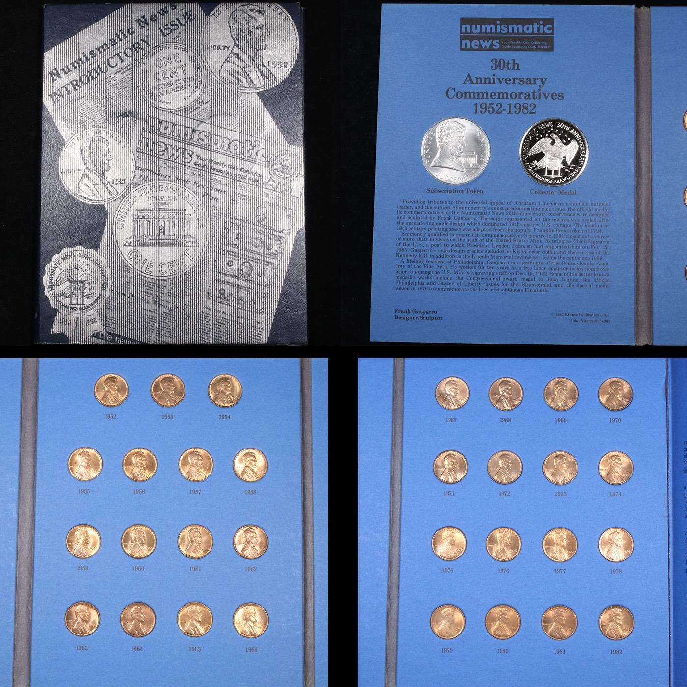 Numismatic News 30th Aniverssery Lincon Cent Book. Contains the 2 Lincon Metals, Also Contains a date set from 1952-1982 Complete. All Gem Cherry Red